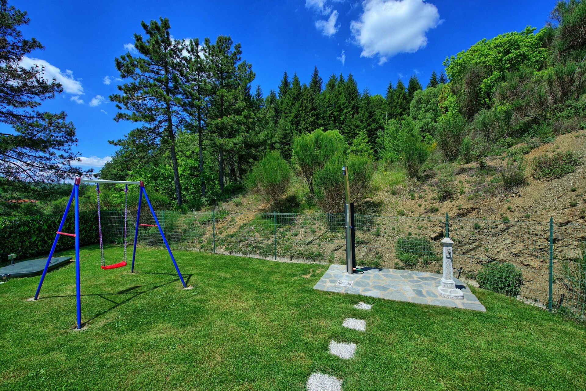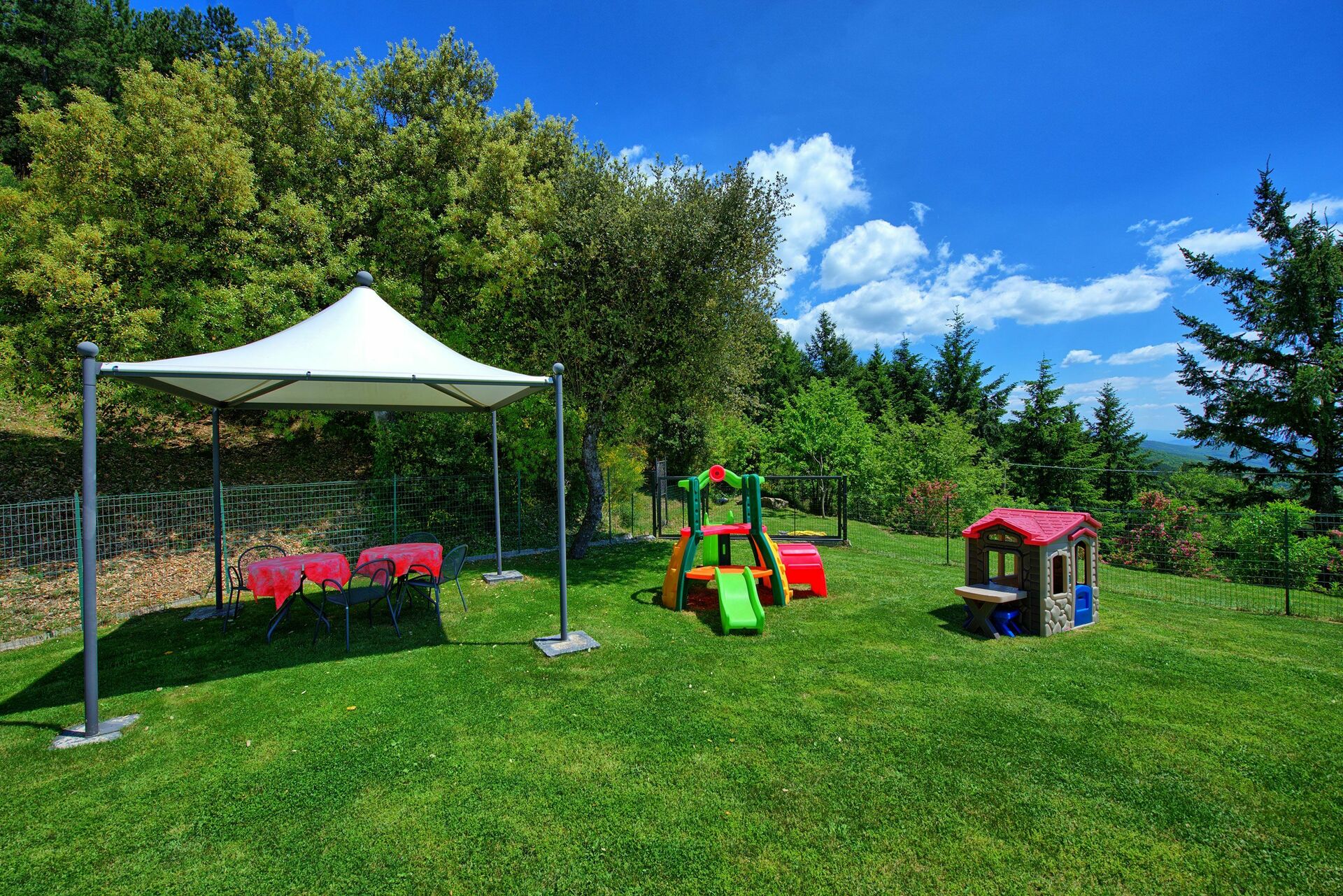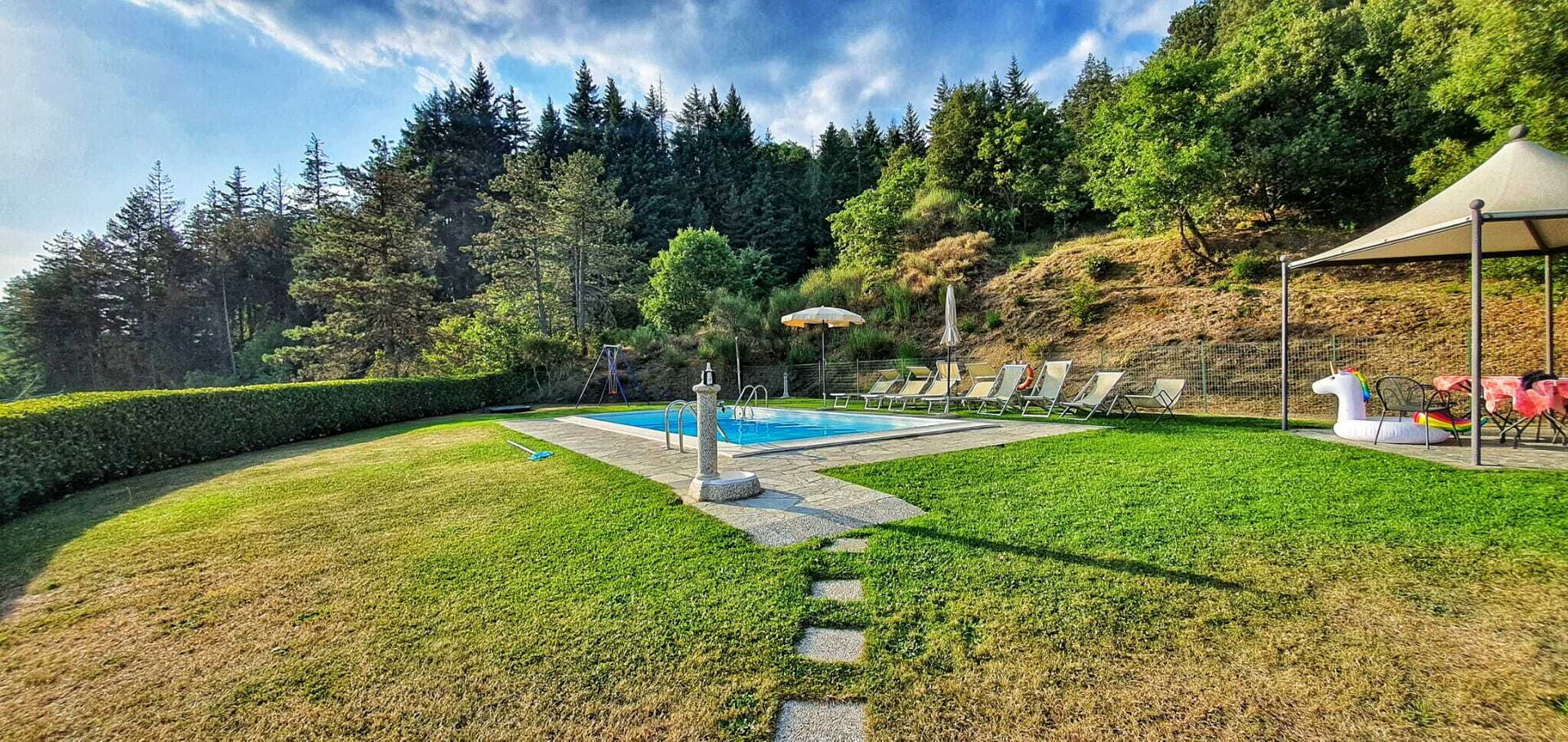La casa gode di un’ottima vista ed il giardino e la zona piscina sono perfettamente curati e puliti ed inoltre offrono una tranquillità e una privacy impagabili! Inoltre i due gazebo, sia davanti a casa che nella zona piscina, permettono di poter mangiare comodamente fuori casa se si vuole grigliare o di fare dei picnic coi bambini direttamente in piscina.