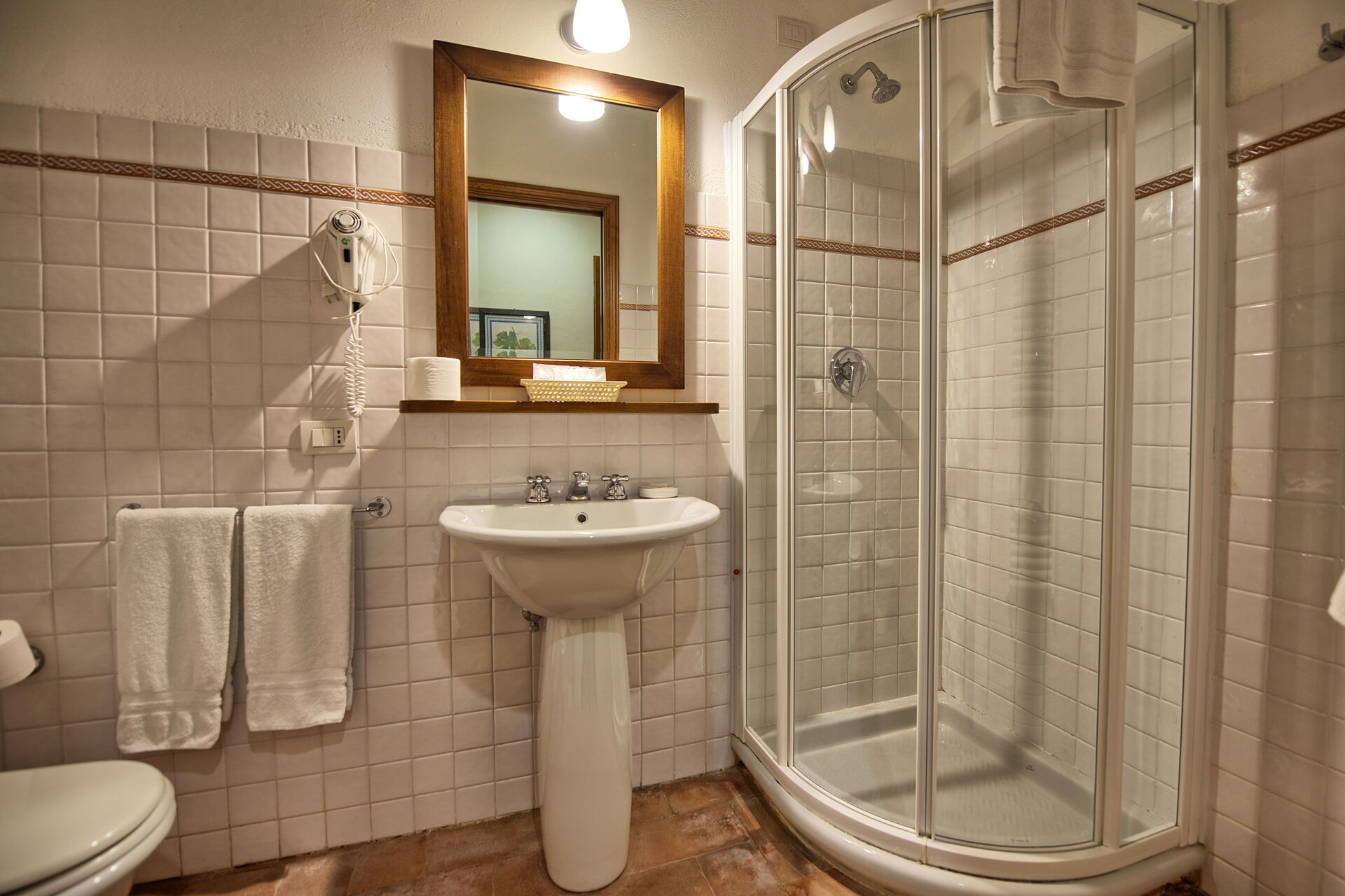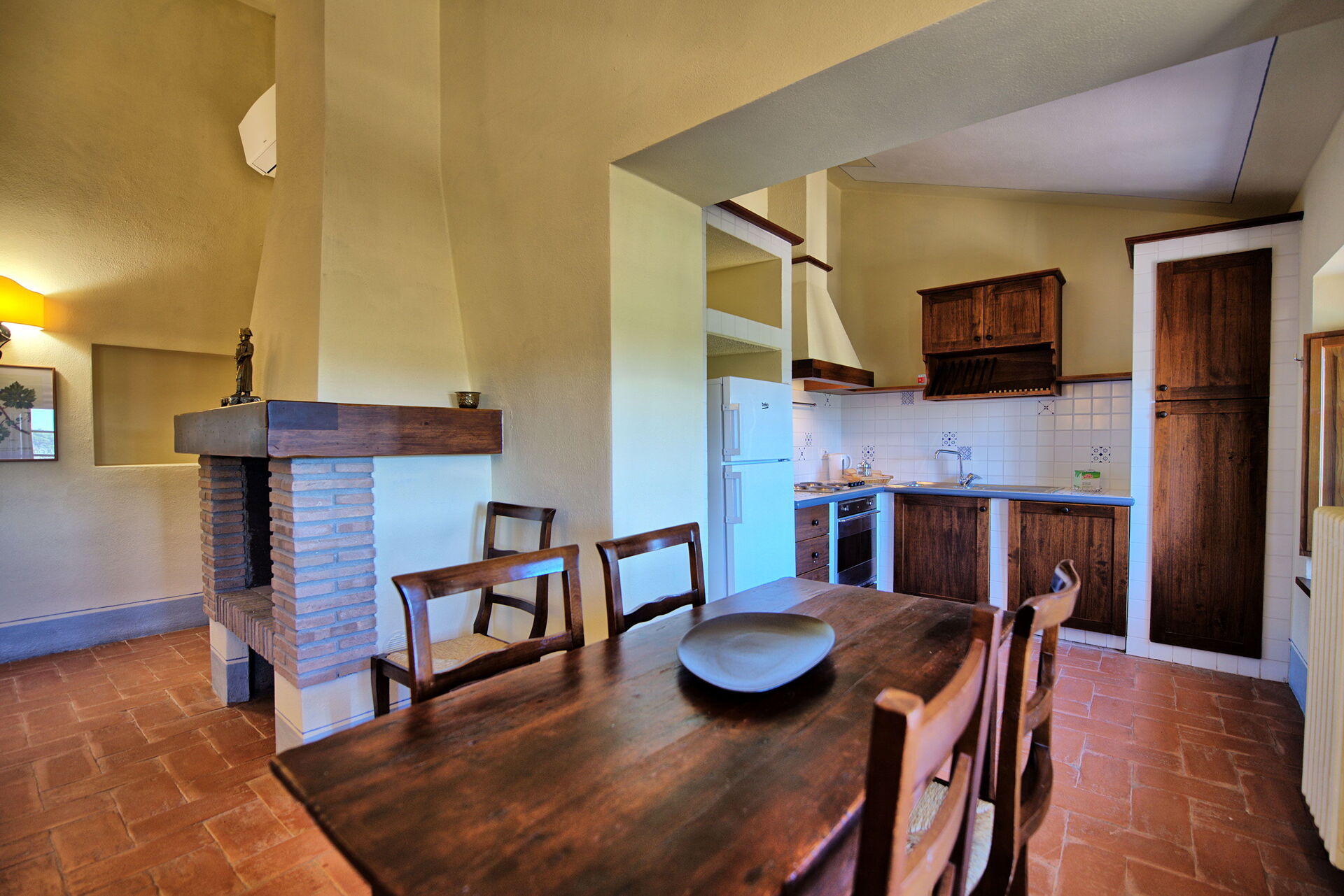 Andre etasje : stor stue (satellitt-TV) med peis og spisestue, kjøkken (stekeovn, fryser, oppvaskmaskin) som vender ut mot stuen, dobbelt soverom (aircondition), bad med dusj, bad med badekar.