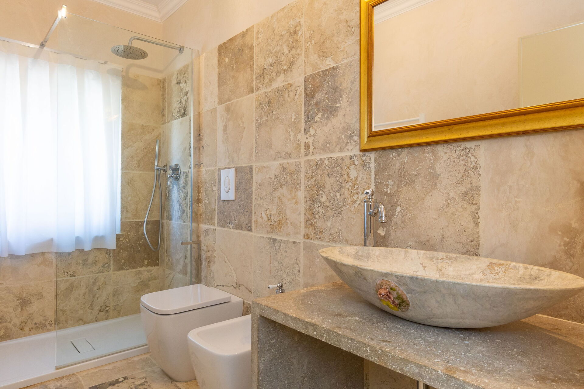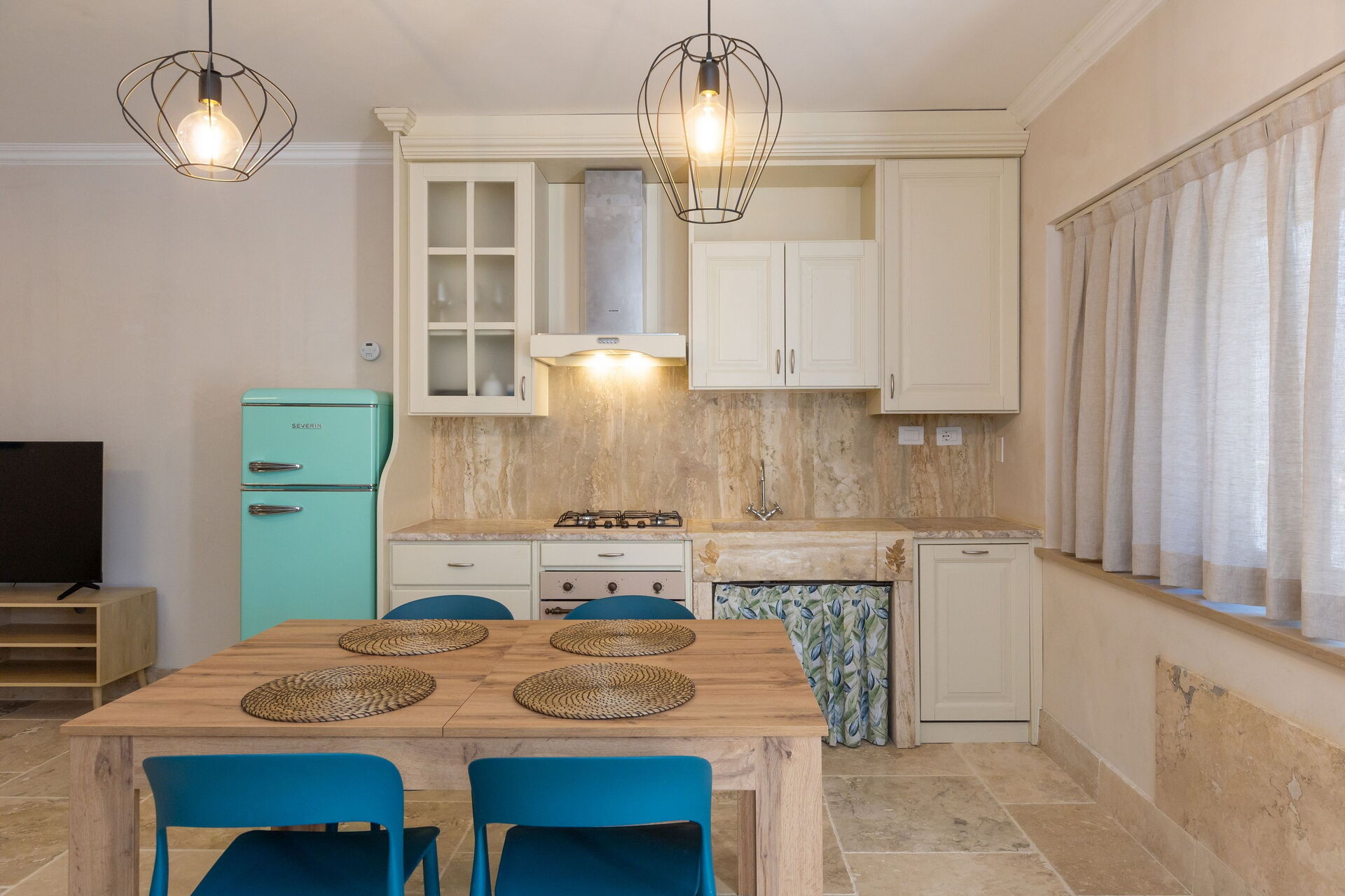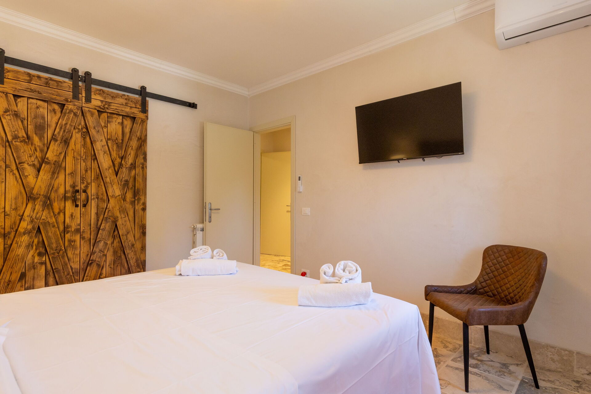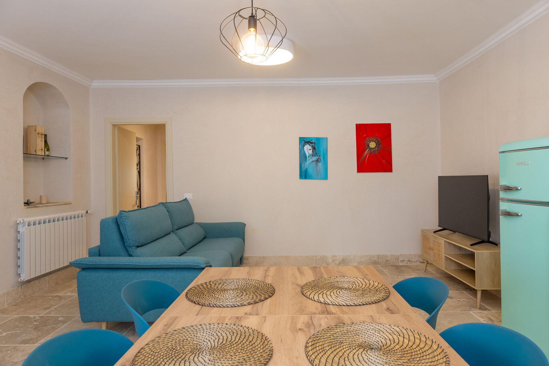 Hevet første etasje: stue (smart-TV, aircondition) med dobbel sovesofa, spiseområde og kjøkkenkrok (oppvaskmaskin, stekeovn, kjøleskap, espressomaskin, brødrister), dobbelt soverom (aircondition), bad med dusj.