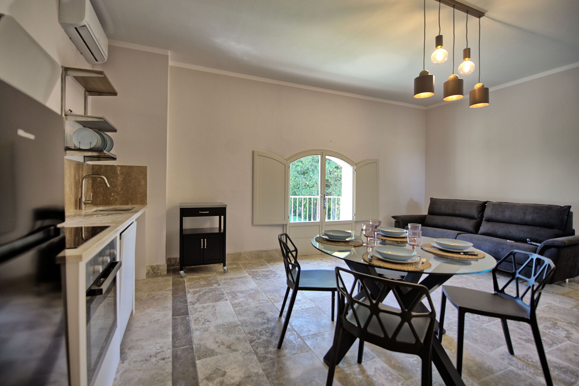 Andre etasje: stue (smart-TV, aircondition) med dobbel sovesofa, spiseområde og kjøkkenkrok (oppvaskmaskin, stekeovn, kjøleskap, espressomaskin, brødrister), dobbelt soverom (aircondition), bad med dusj.