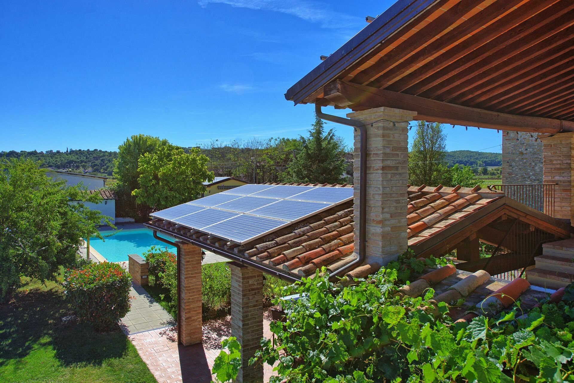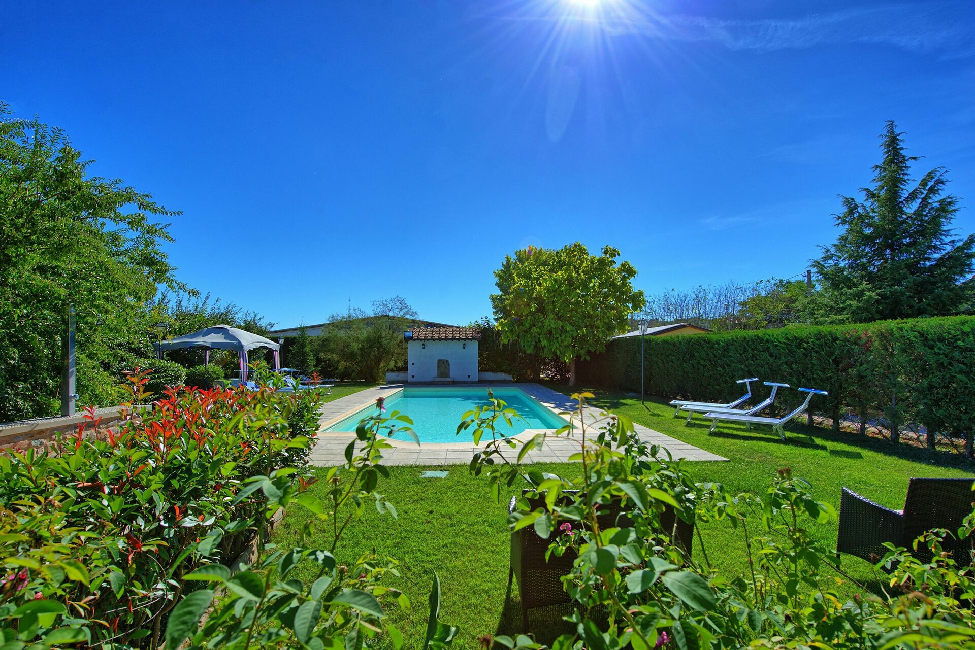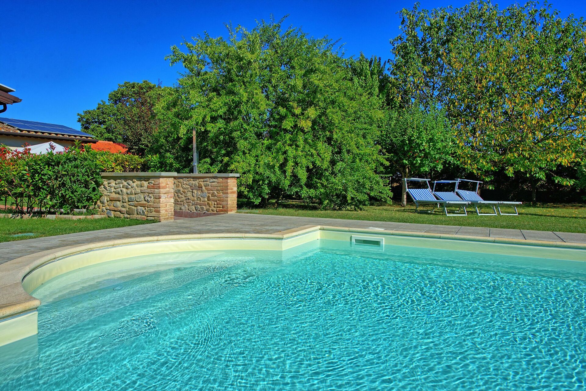 The pool offers a welcome refreshment with sun loungers laid out in a well-maintained yet natural garden.