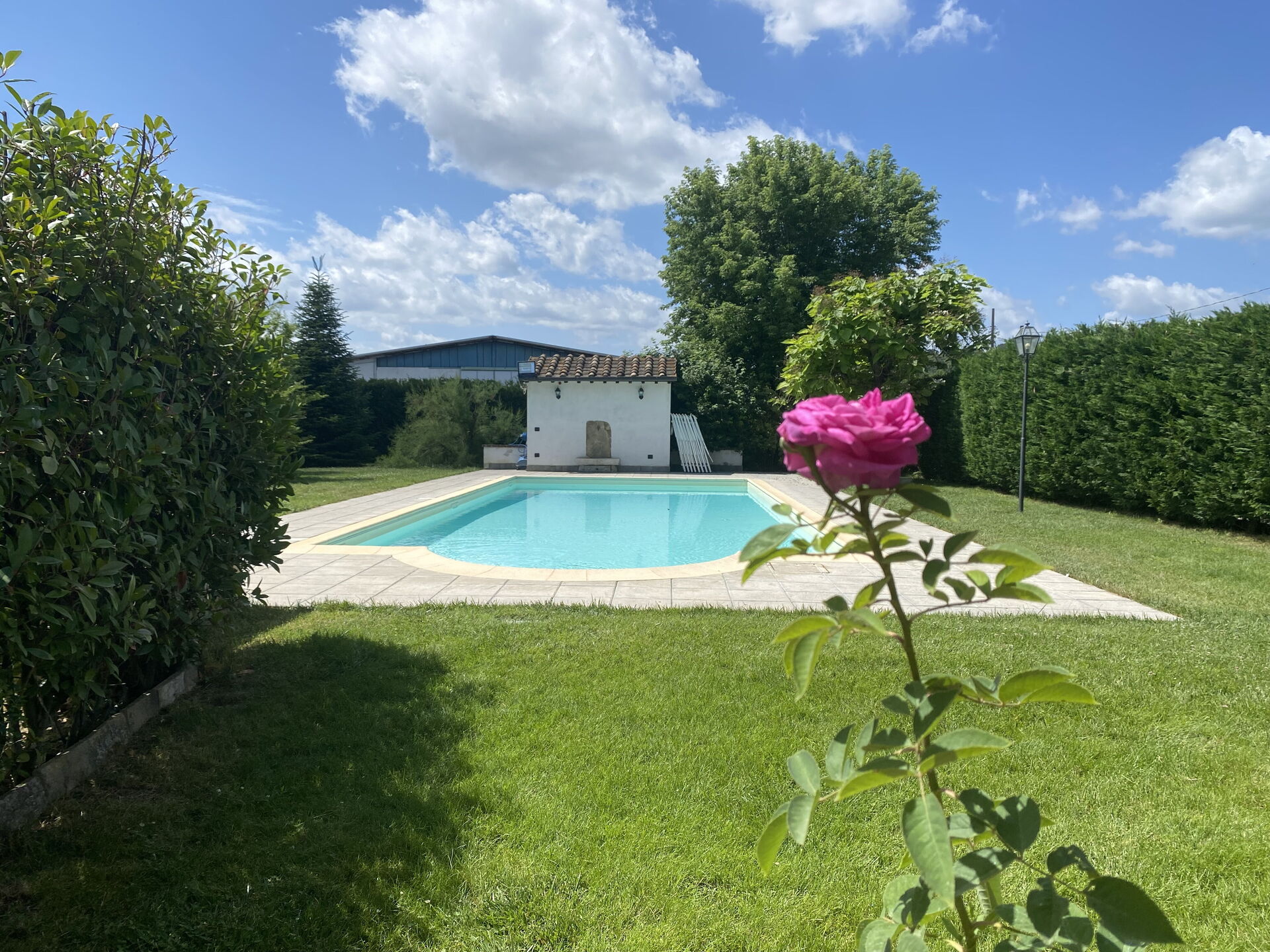 Svømmebassenget er omgitt av en stor hekk som fungerer som et gjerde slik at det ikke er noe innsyn.
