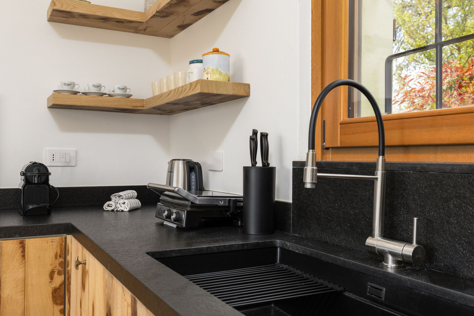 Første etasje: entré og stor oppholdsplass (piano) samt kjøkken (ovn, fryser, mikrobølgeovn, Nespresso-kaffemaskin, brødrister, vannkoker, vaskemaskin), dobbeltrom, bad med dusj.