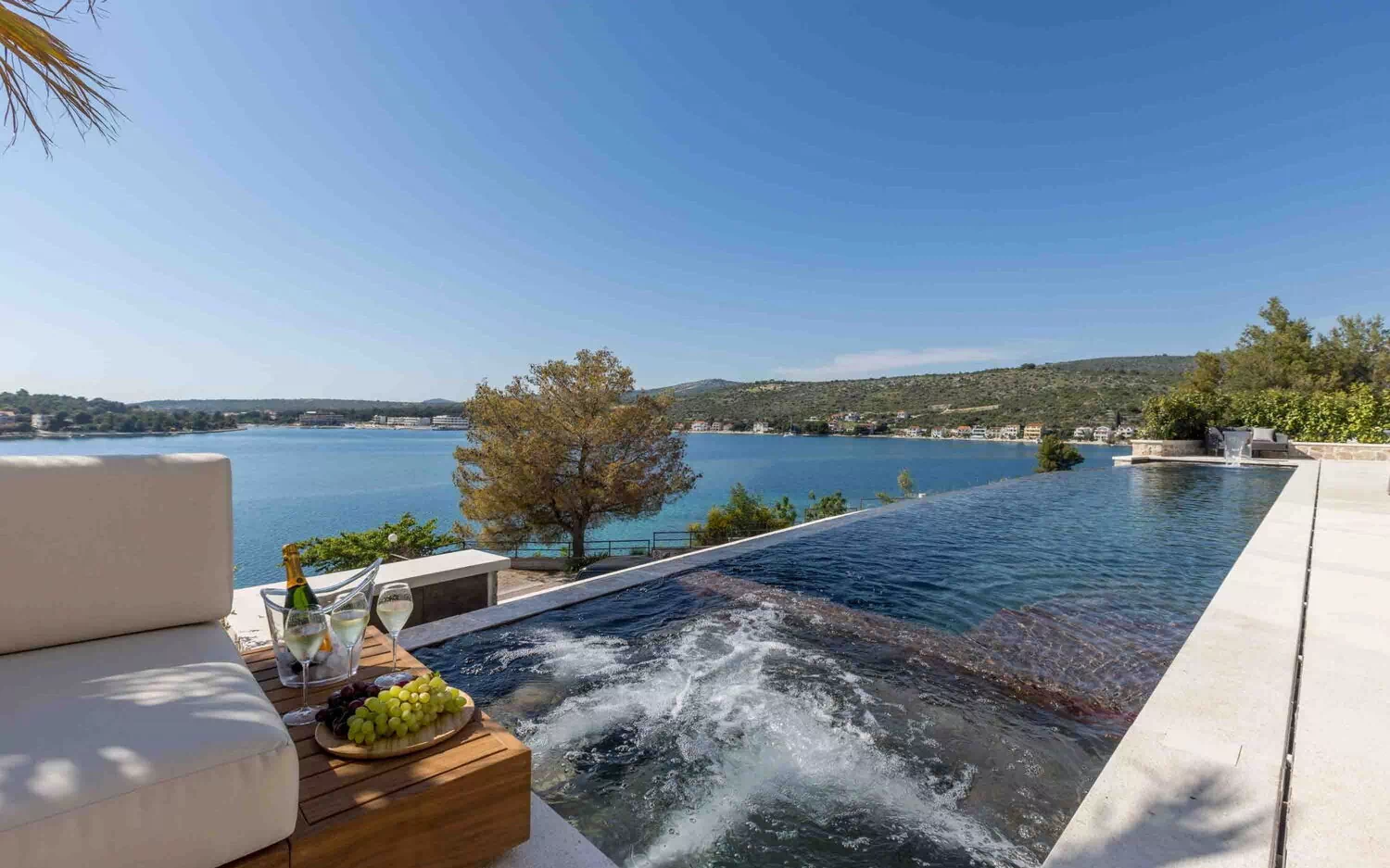 Villa Olive Vista 1 byr også på et pent uteområde med en fantastisk solterrasse med et elegant, oppvarmbart infinity-basseng med bobleområde hvor du kan beundre fortryllende solnedganger over havet. Utendørs er det også et område med bord, stoler og grill hvor gjestene kan nyte måltider utendørs.