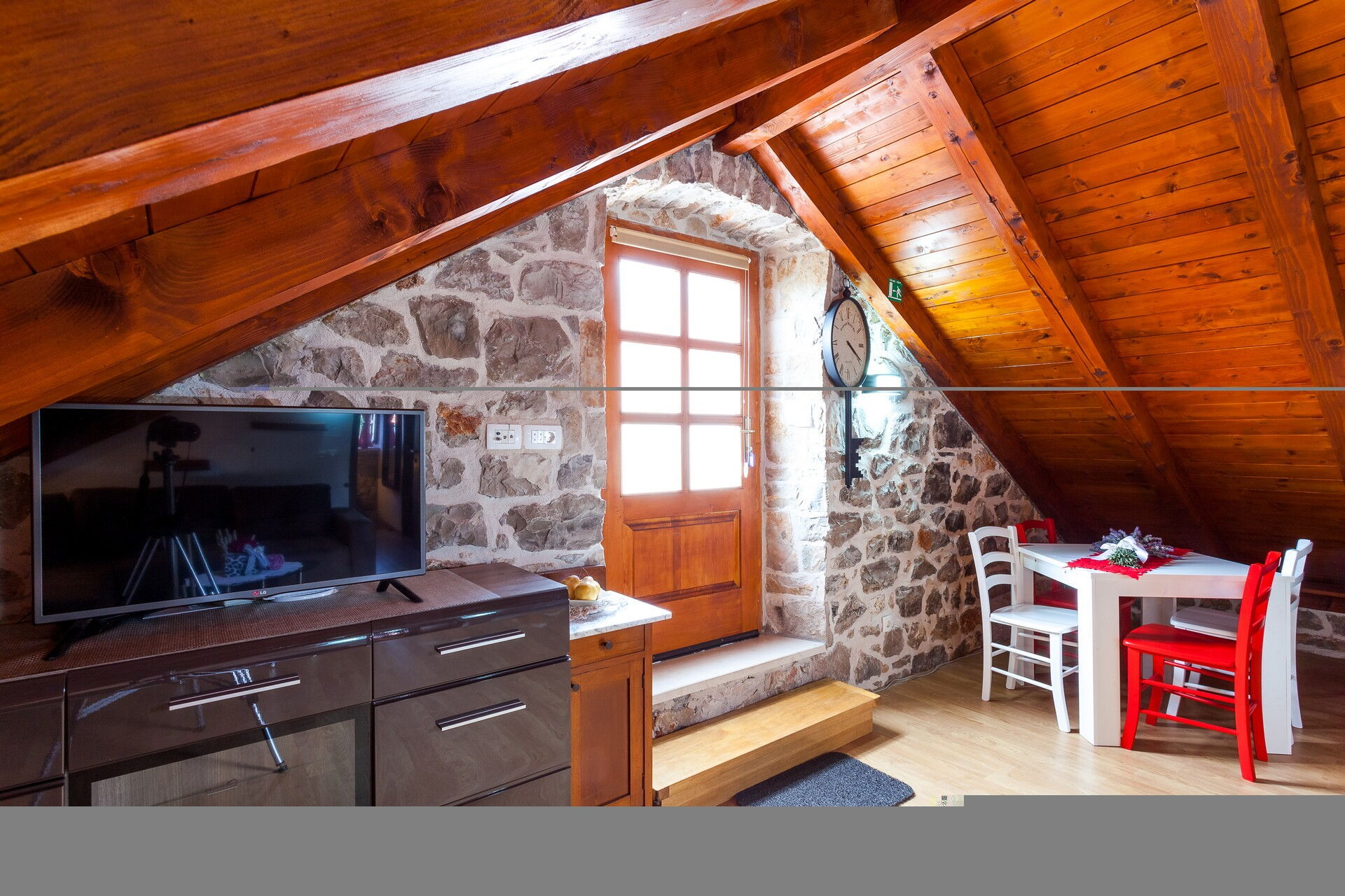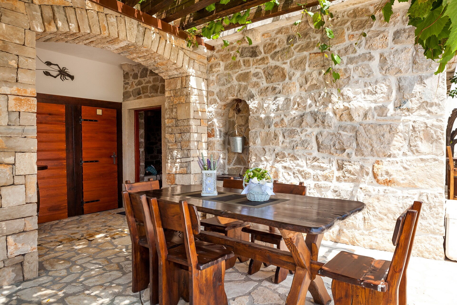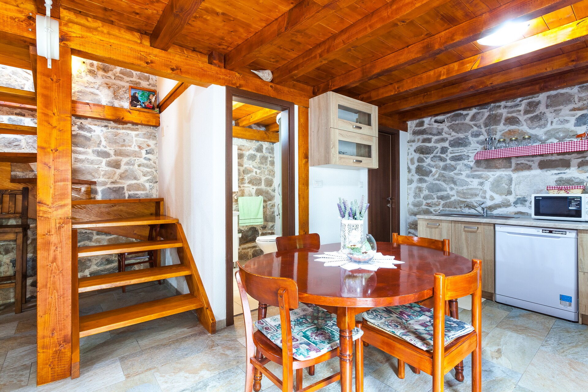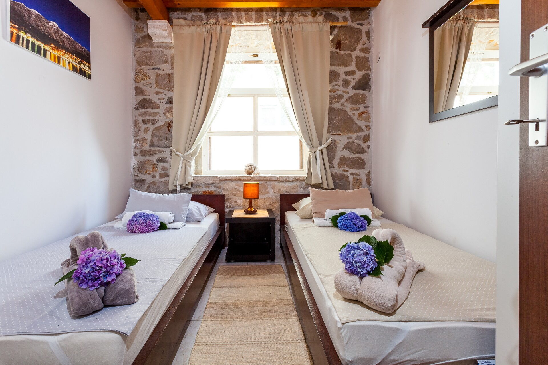 Ferieiendommen består av 3 små leiligheter og kan romme opptil 14 personer. To av de tre leilighetene er gamle dalmatiske hus som er pusset opp i tro til opprinnelig stil.