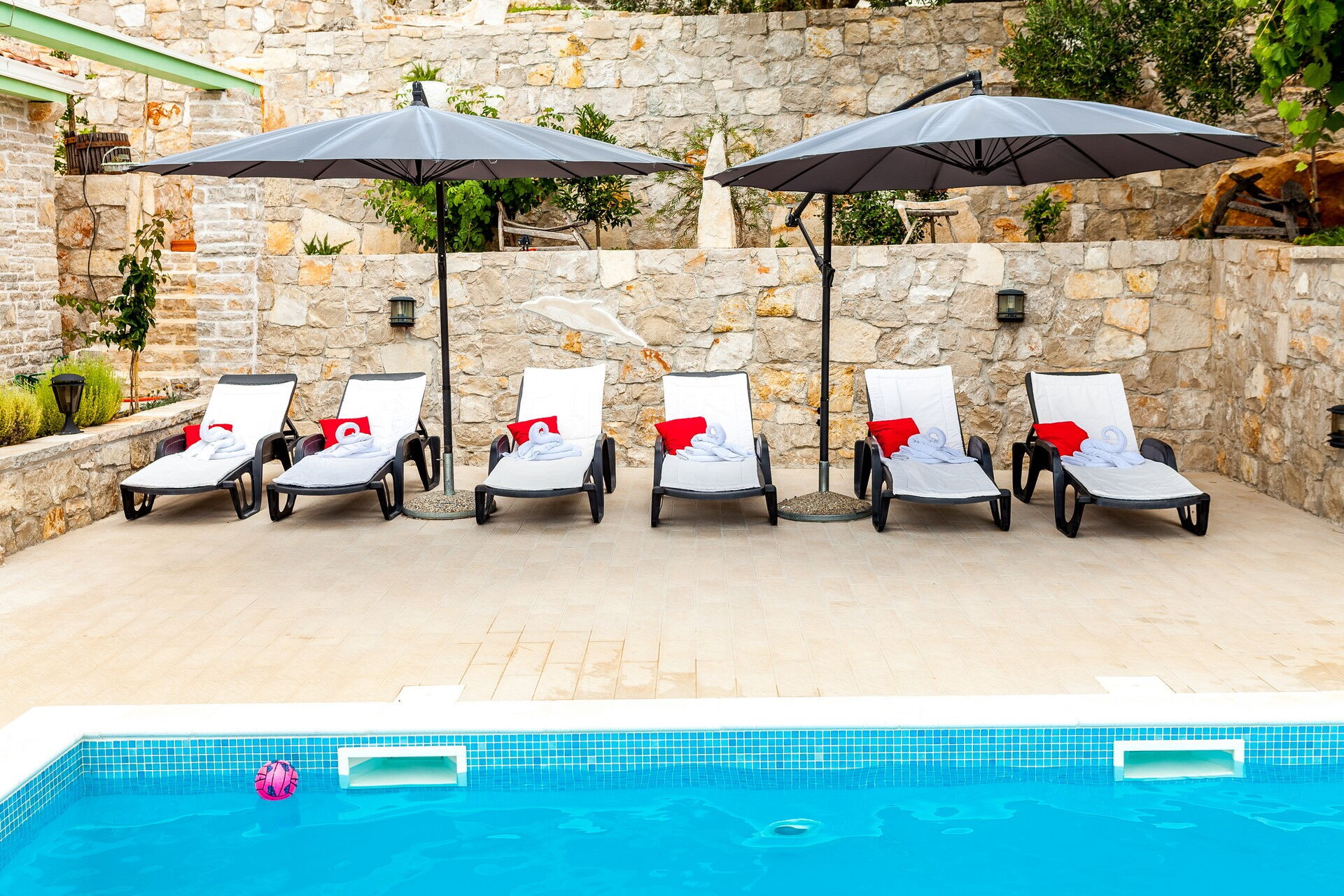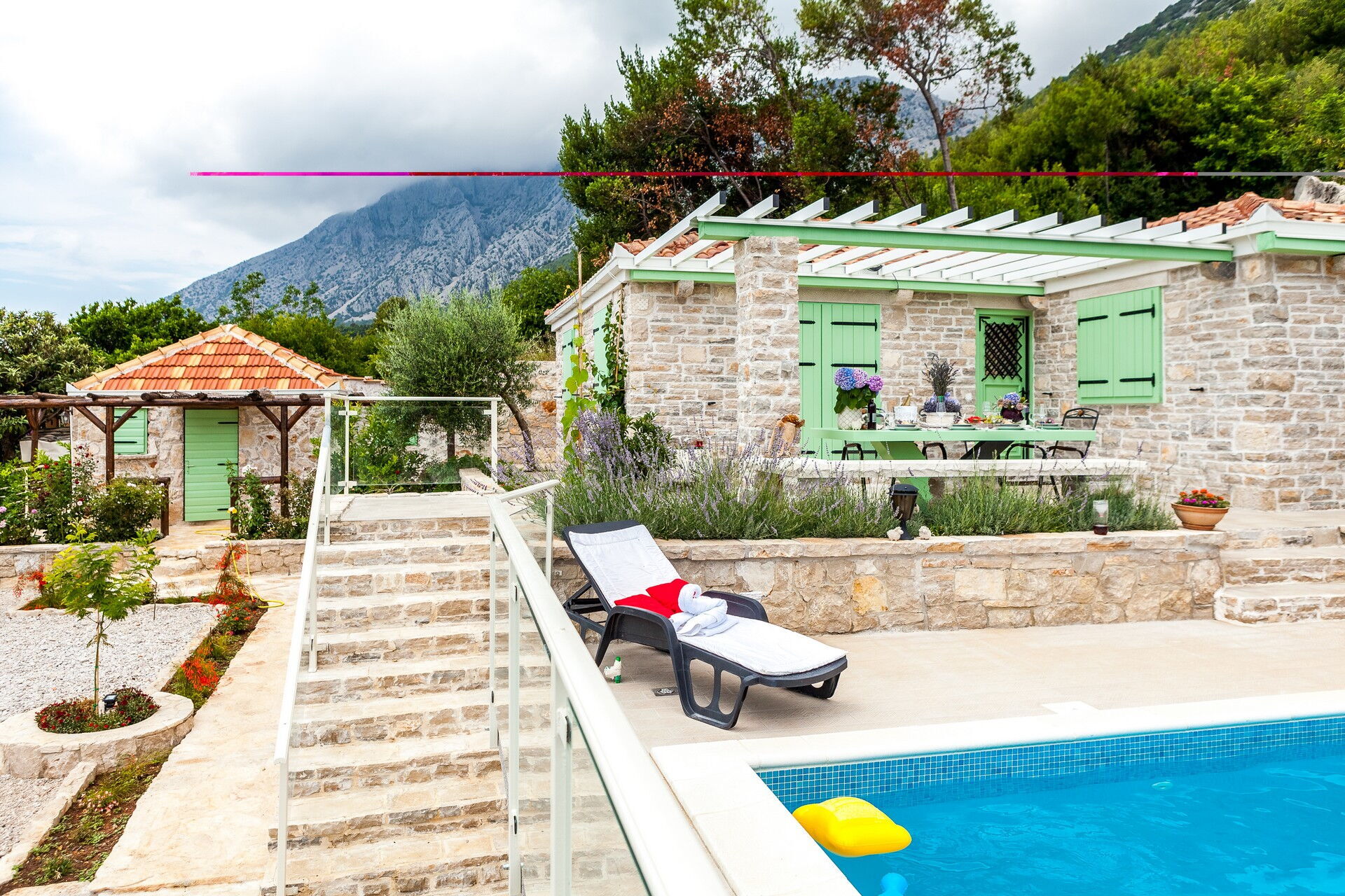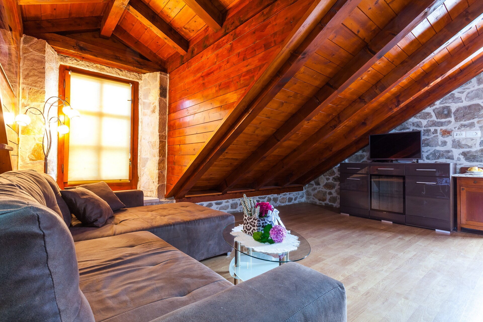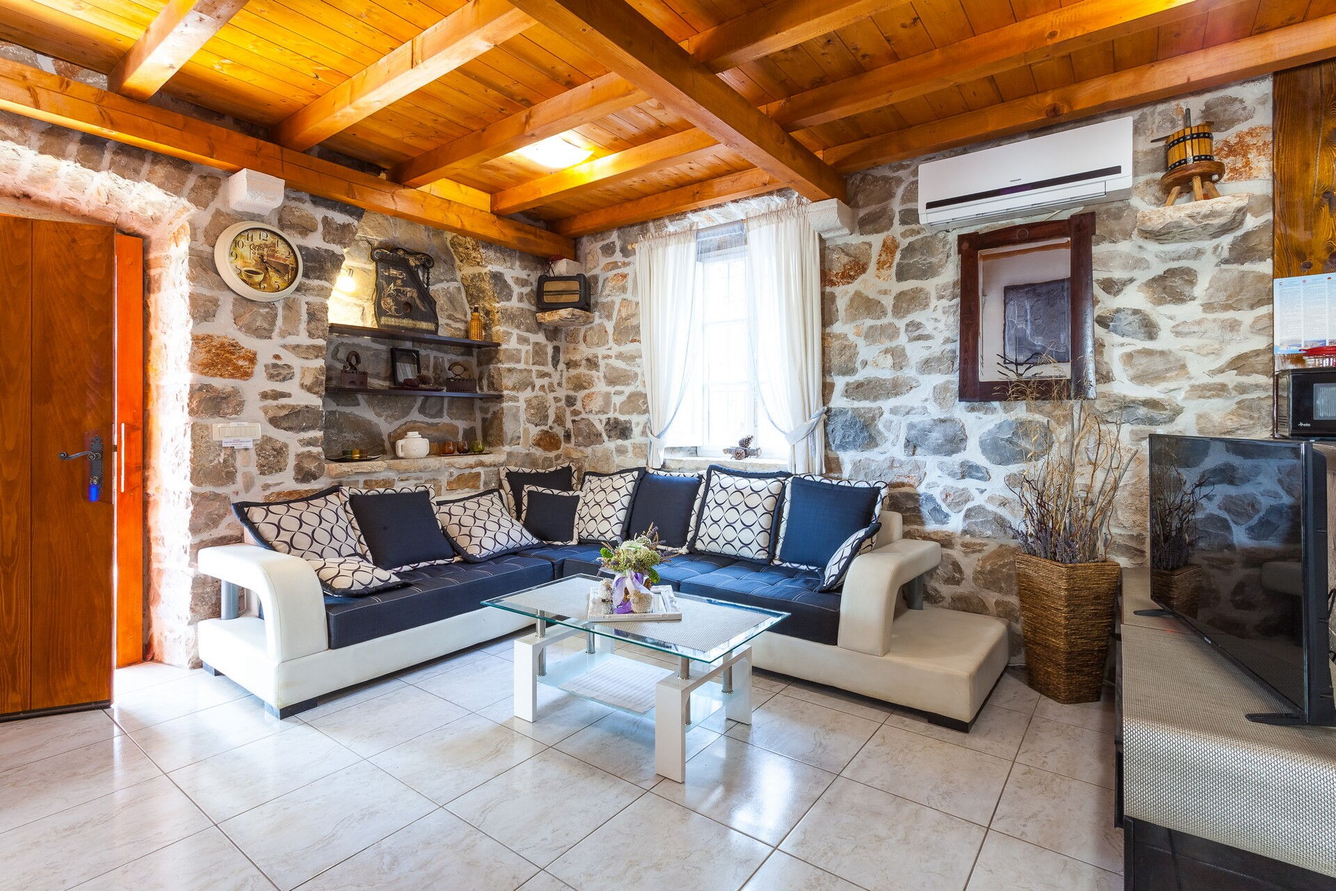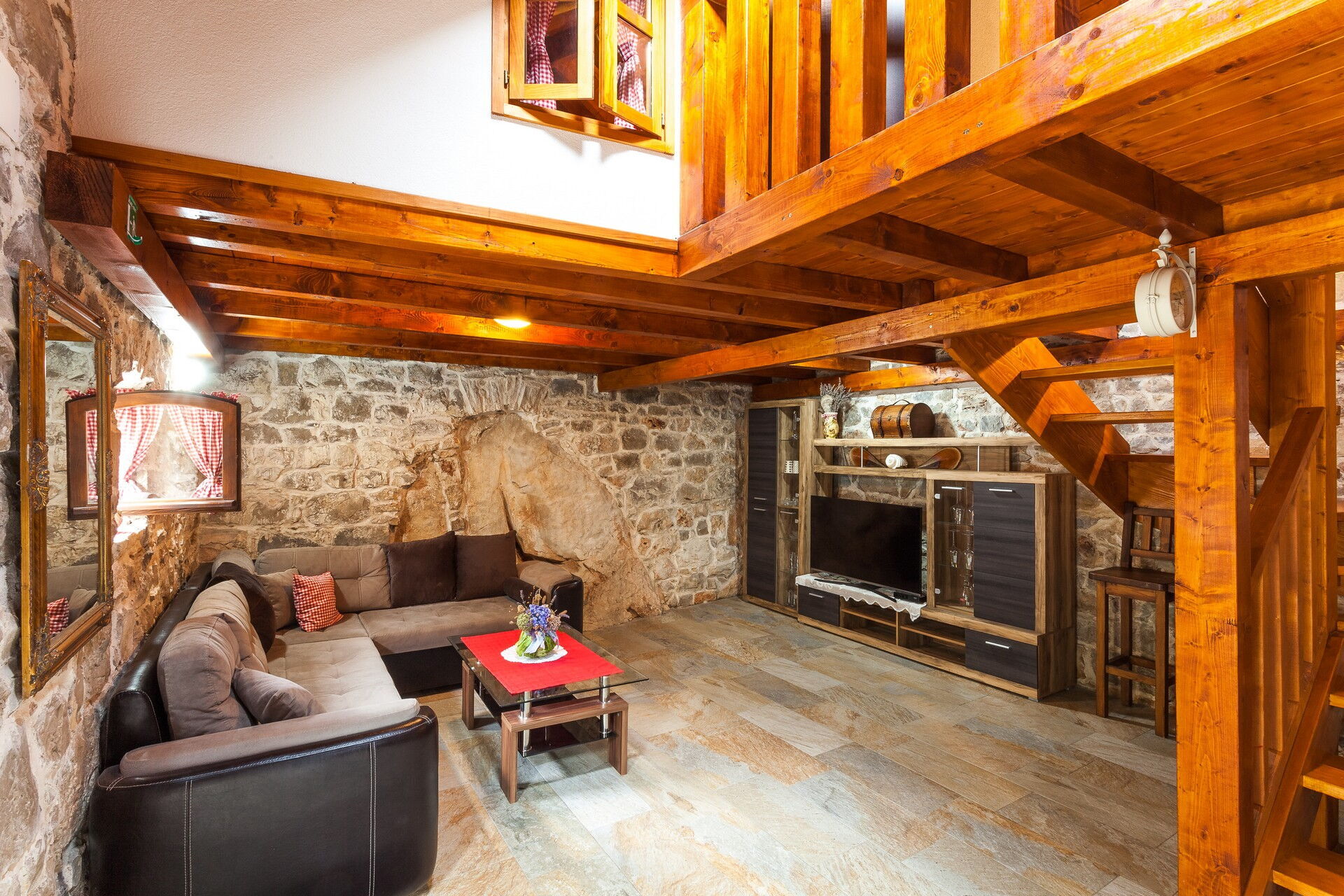 Ferieiendommen består av 3 små leiligheter og kan romme opptil 14 personer. To av de tre leilighetene er gamle dalmatiske hus som er pusset opp i tro til opprinnelig stil.