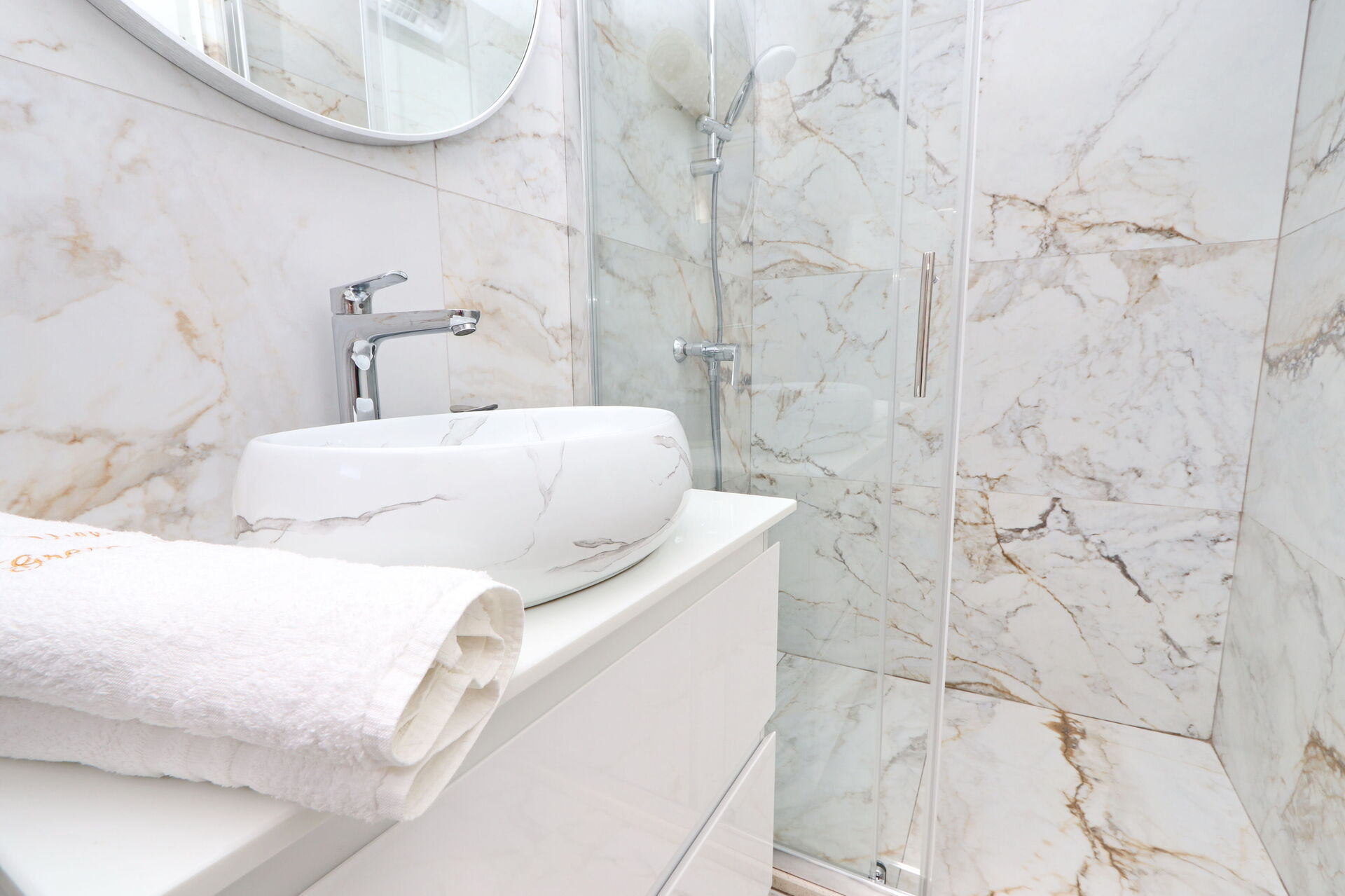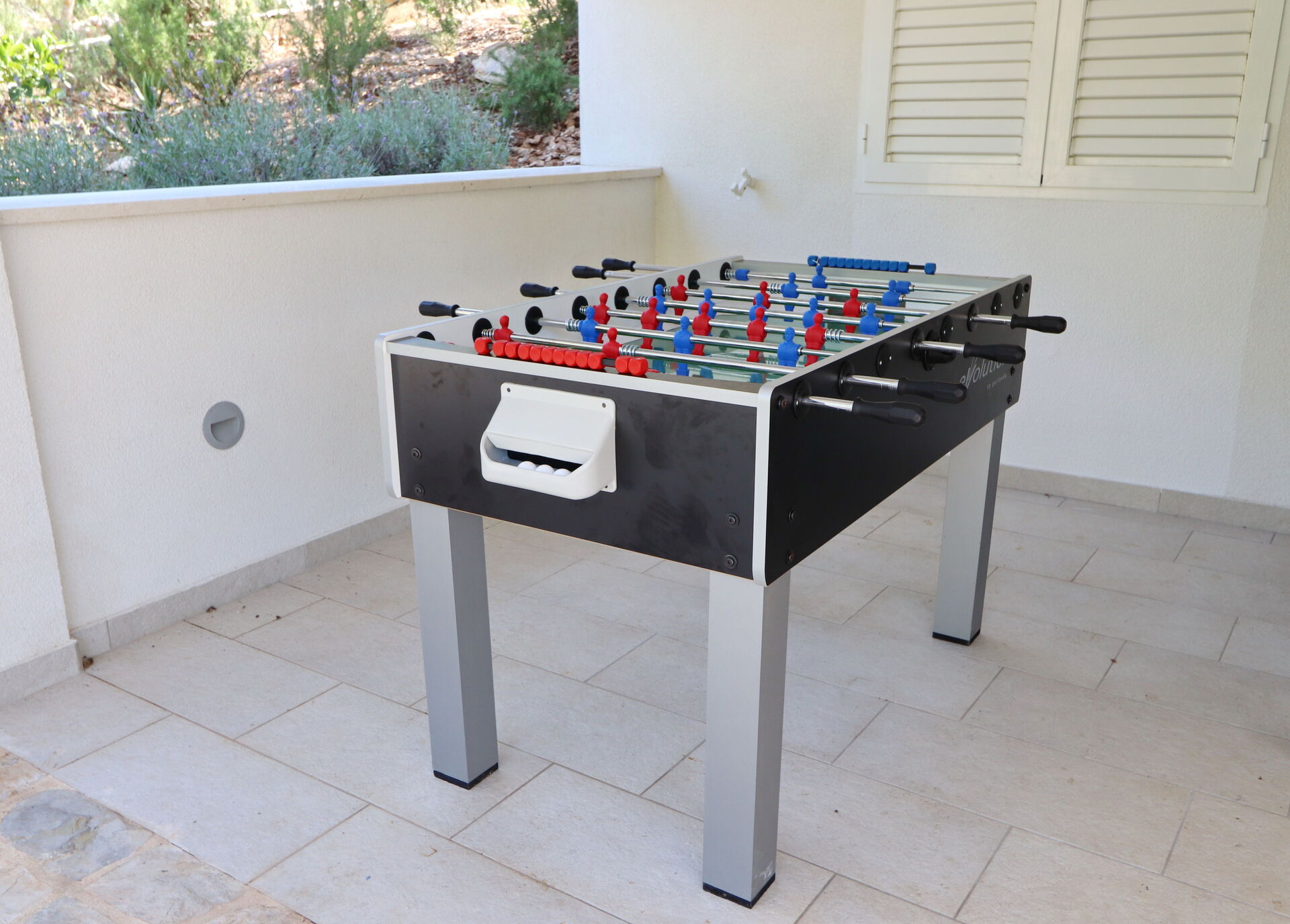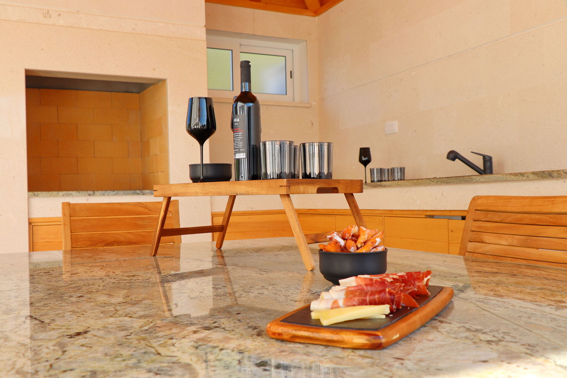Utenfor, i bassengområdet, er det en romslig overbygd veranda med et utendørs kjøkken med en innebygd grill og vask. Her kan alle gjestene i huset samles for å spise og slappe av sammen.
