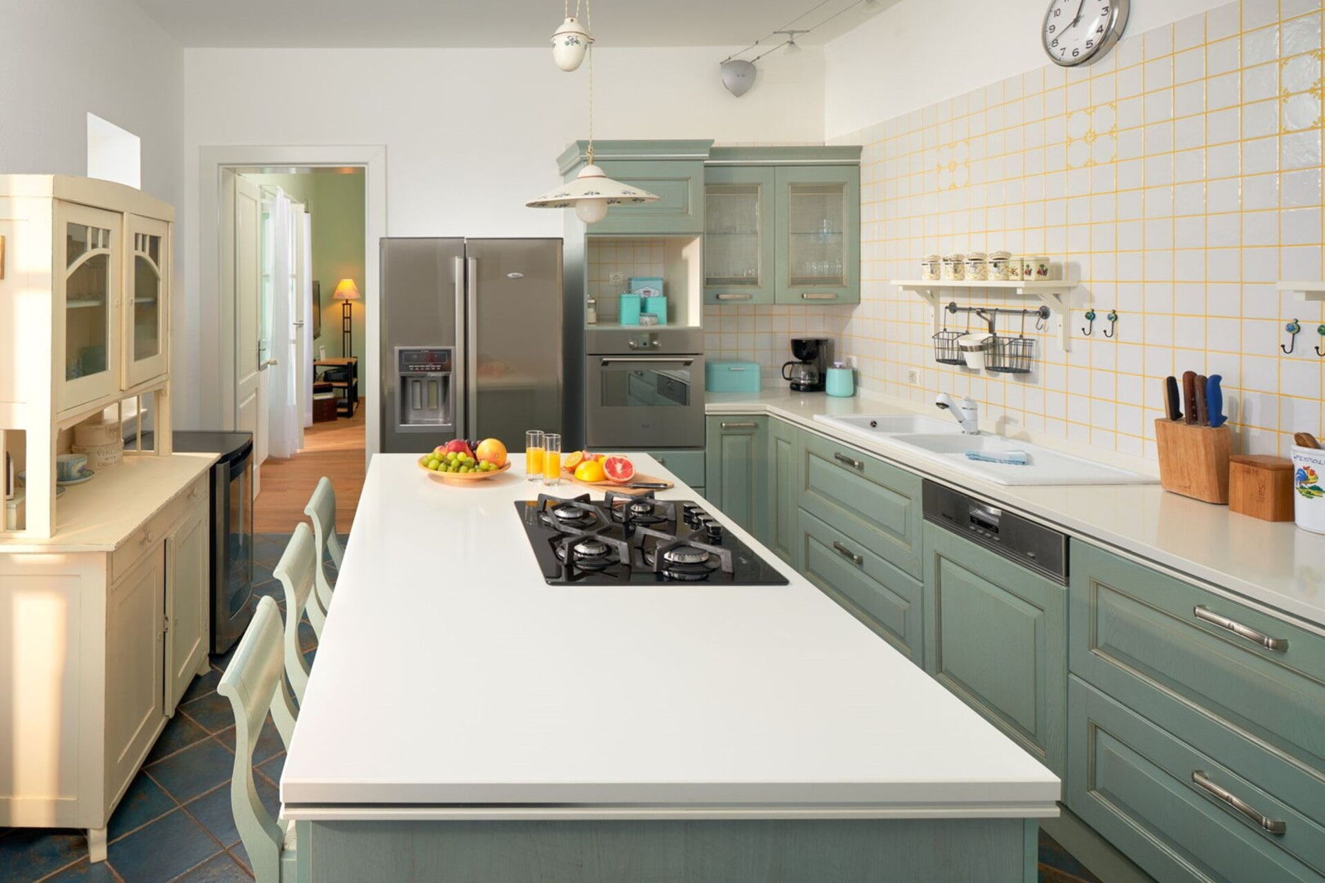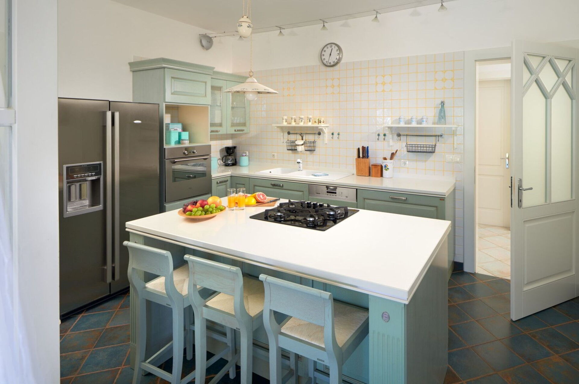 Inngang til stor stue (peis), kjøkken (fryser, kjøleskap, kokeplater, stekeovn, oppvaskmaskin, mikrobølgeovn, brødrister, kaffemaskin), spiseplass, bad med dusj og badekar, vaskerom med vaskemaskin.