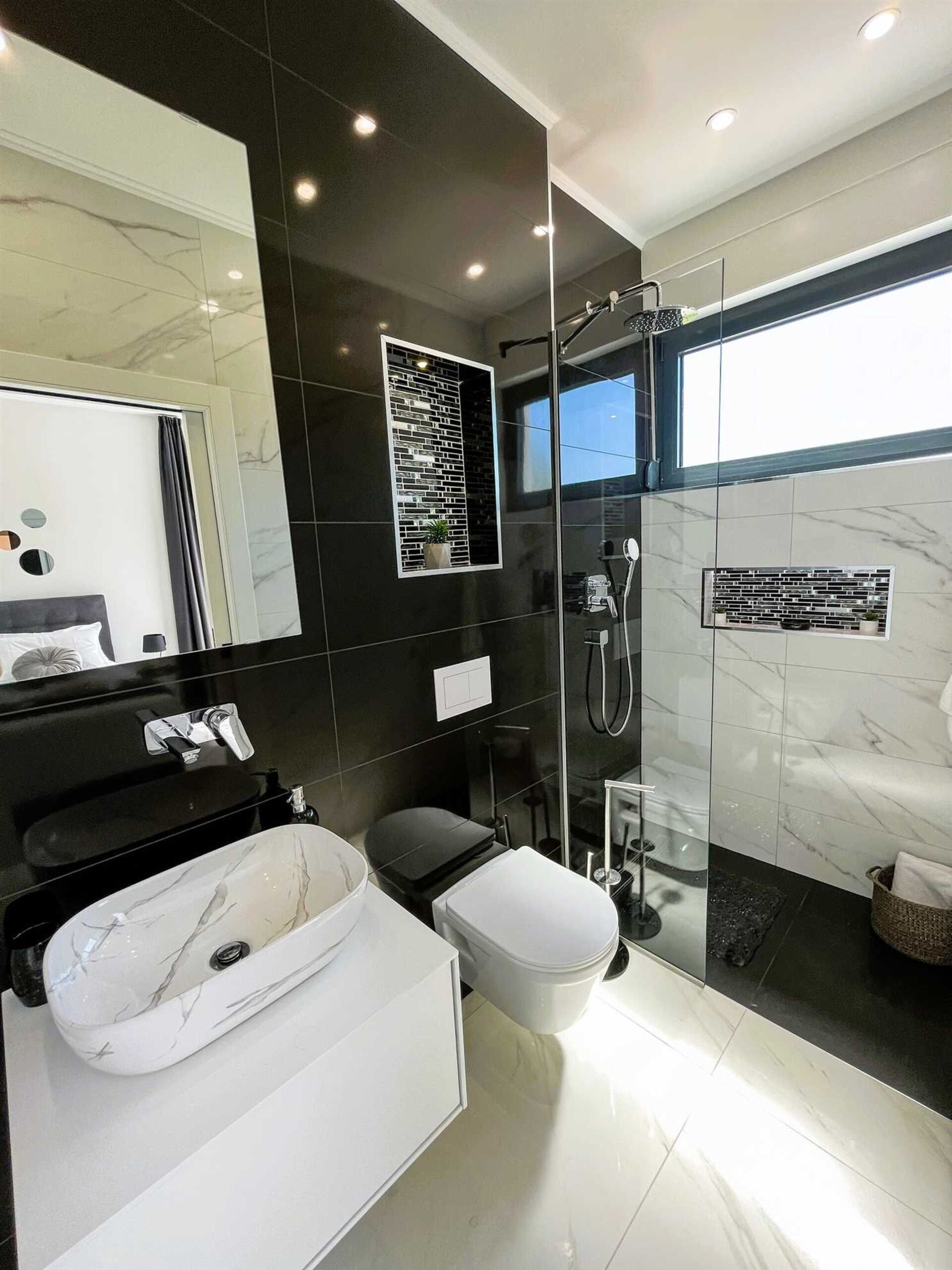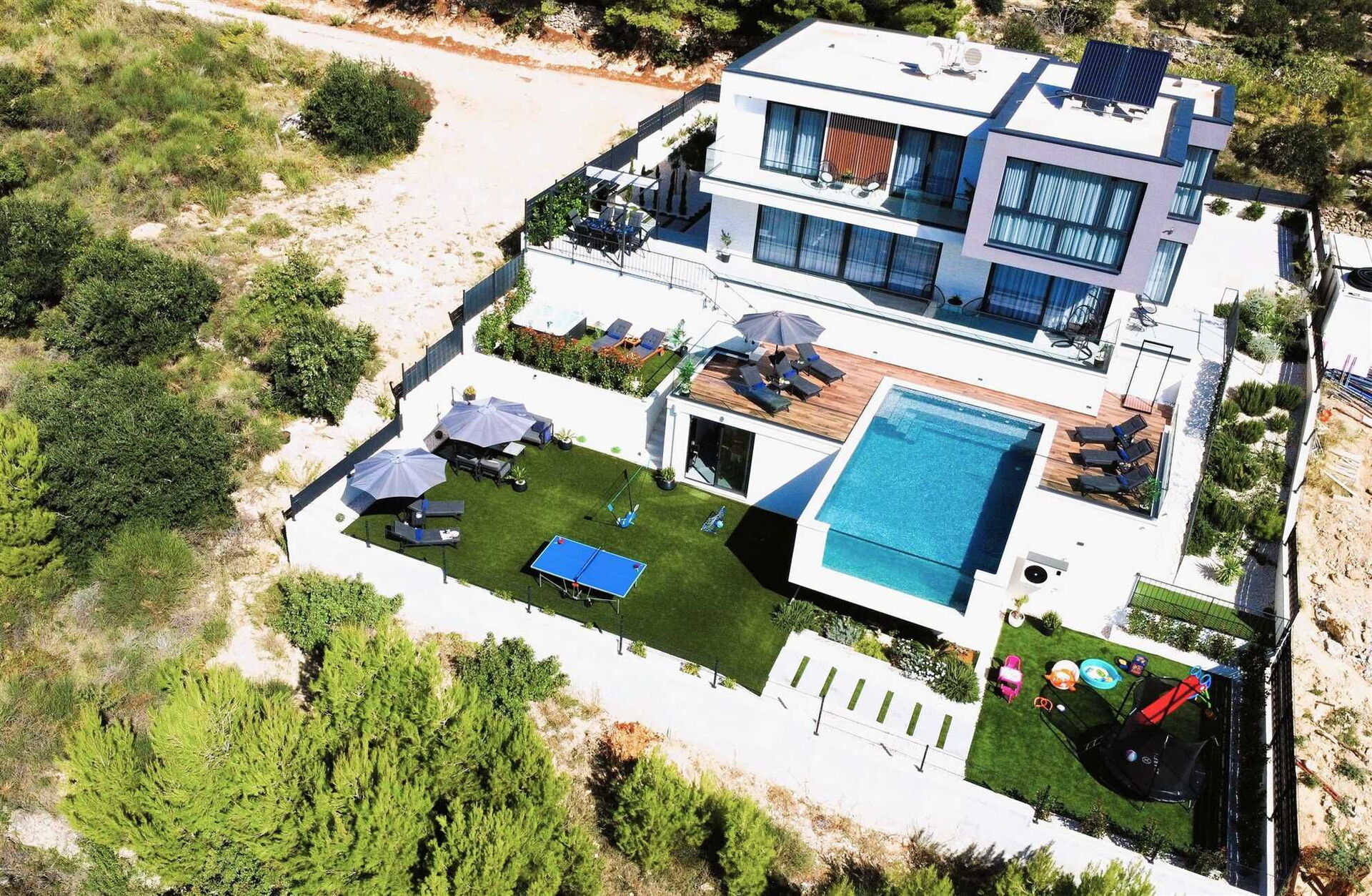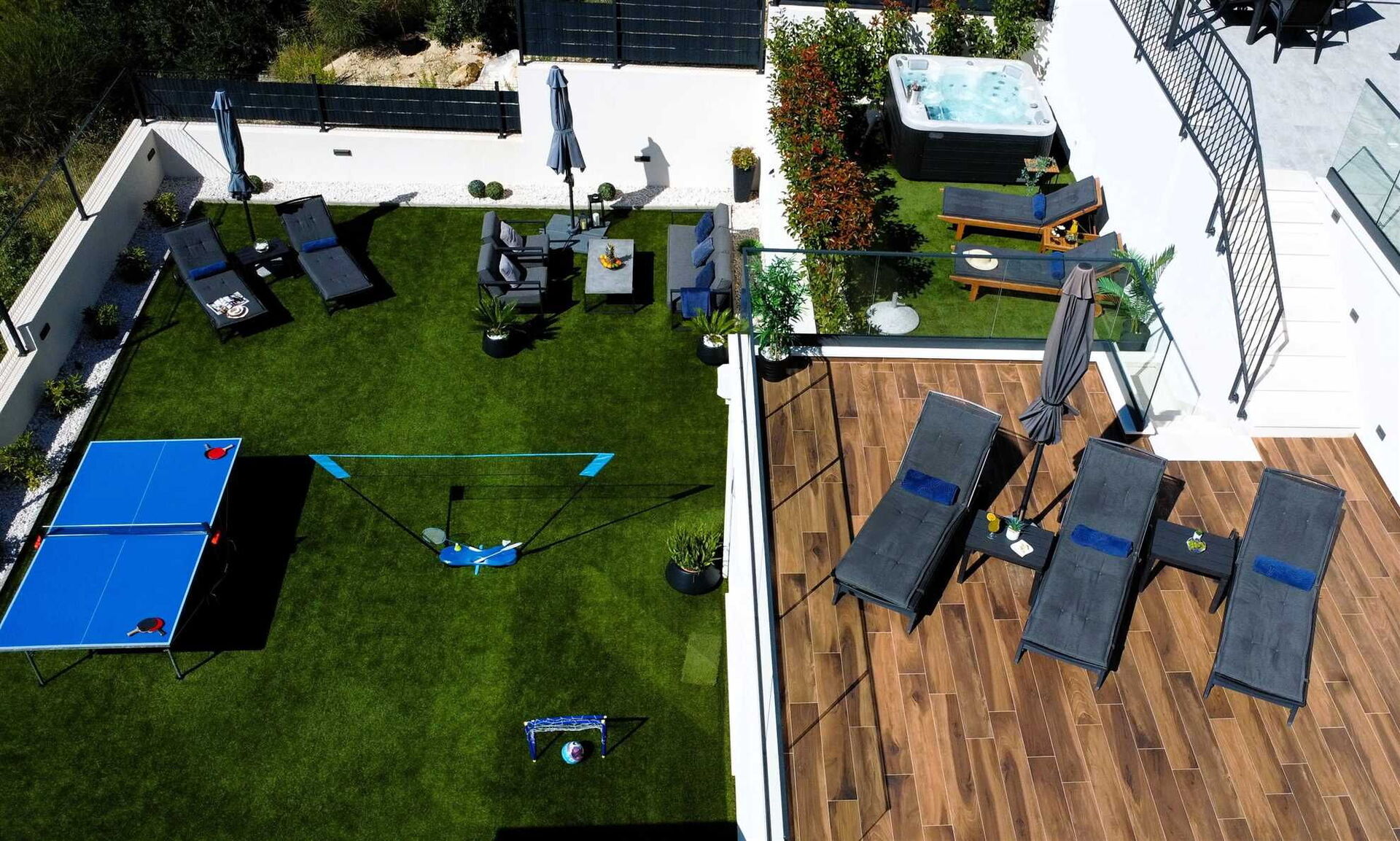 Villa Nikta og eiendommen er delt inn i flere nivåer, både innvendig og utvendig. Innvendig er huset fordelt på 2 etasjer med 5 soverom og 5 bad, med plass til opptil 10 personer. Den terrasserte utendørshagen på flere nivåer har et område med boblebad, et spektakulært svømmebasseng og et lekeområde for barn med trampoline og bordtennisbord.