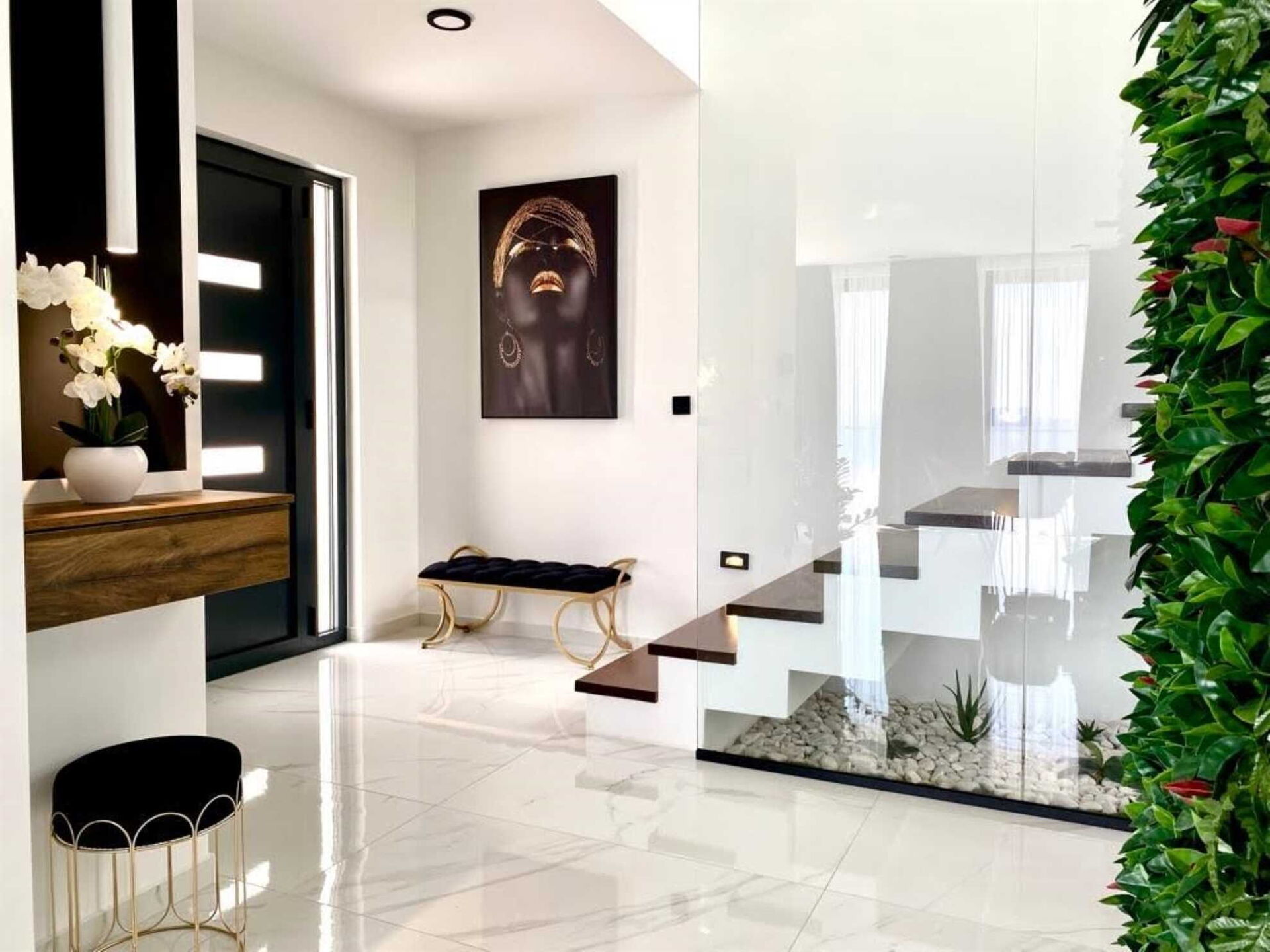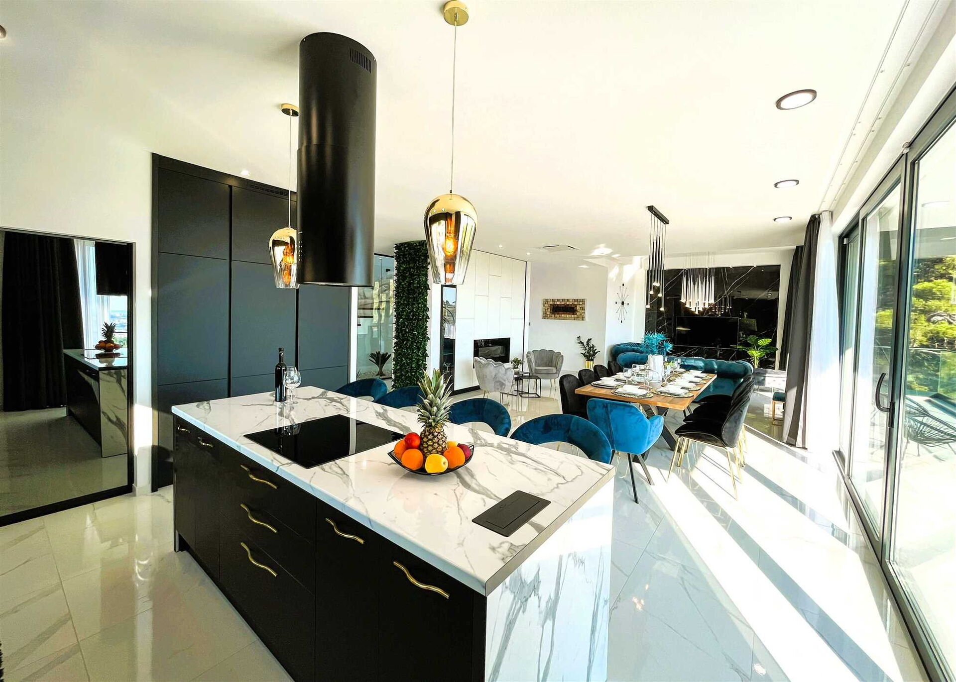 Interiøret er romslig, lyst og fint innredet, og for de som også ønsker å holde seg i form i løpet av ferien, er det et lite treningsstudio med tilgang fra hagen under bassengnivået.