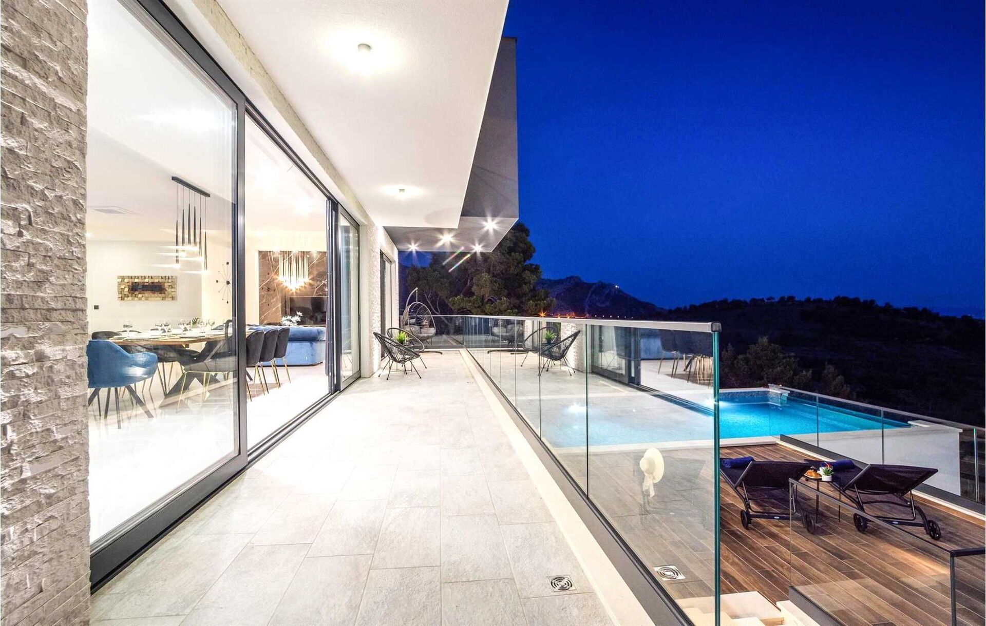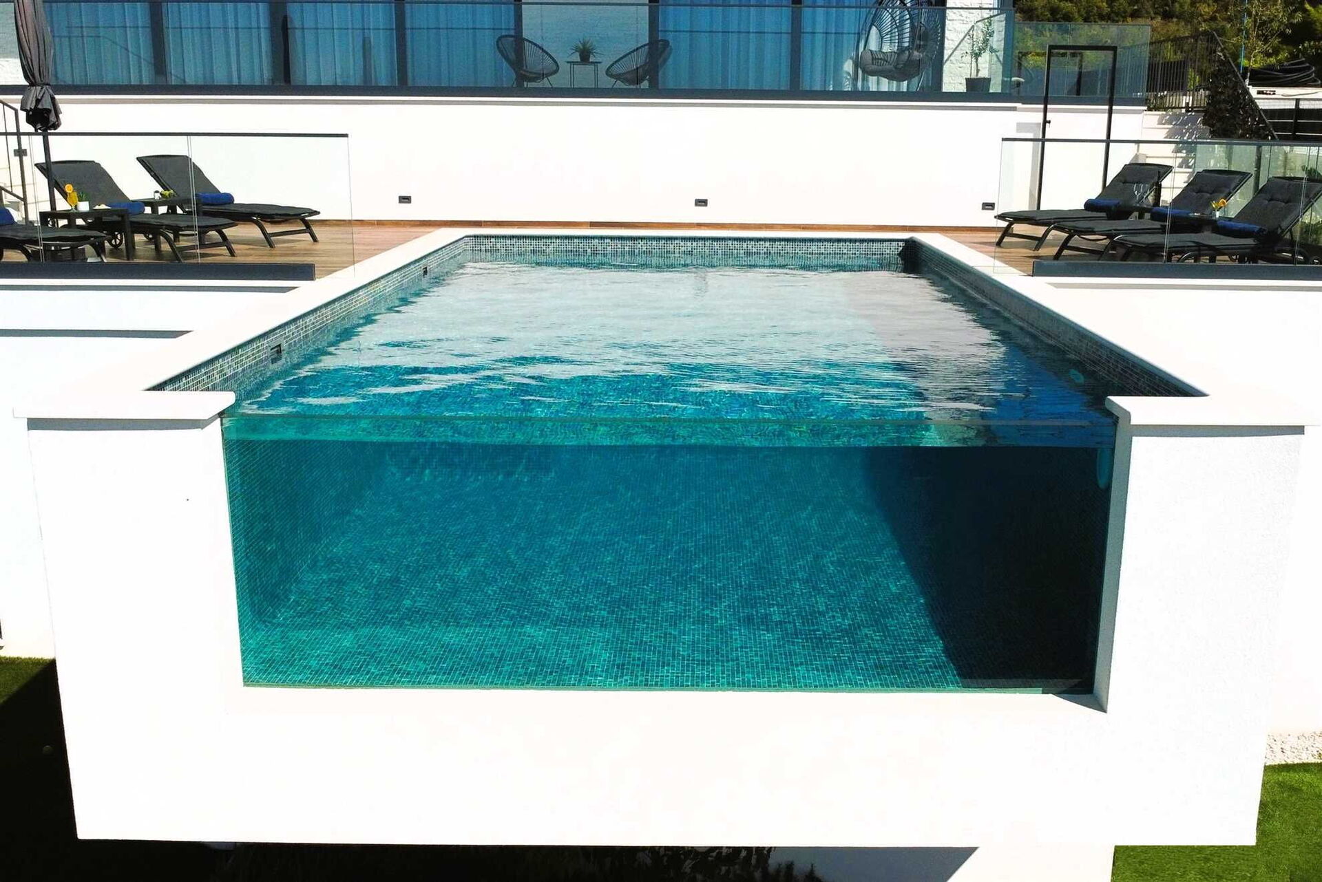 - Stort bassengdekk med solsenger
