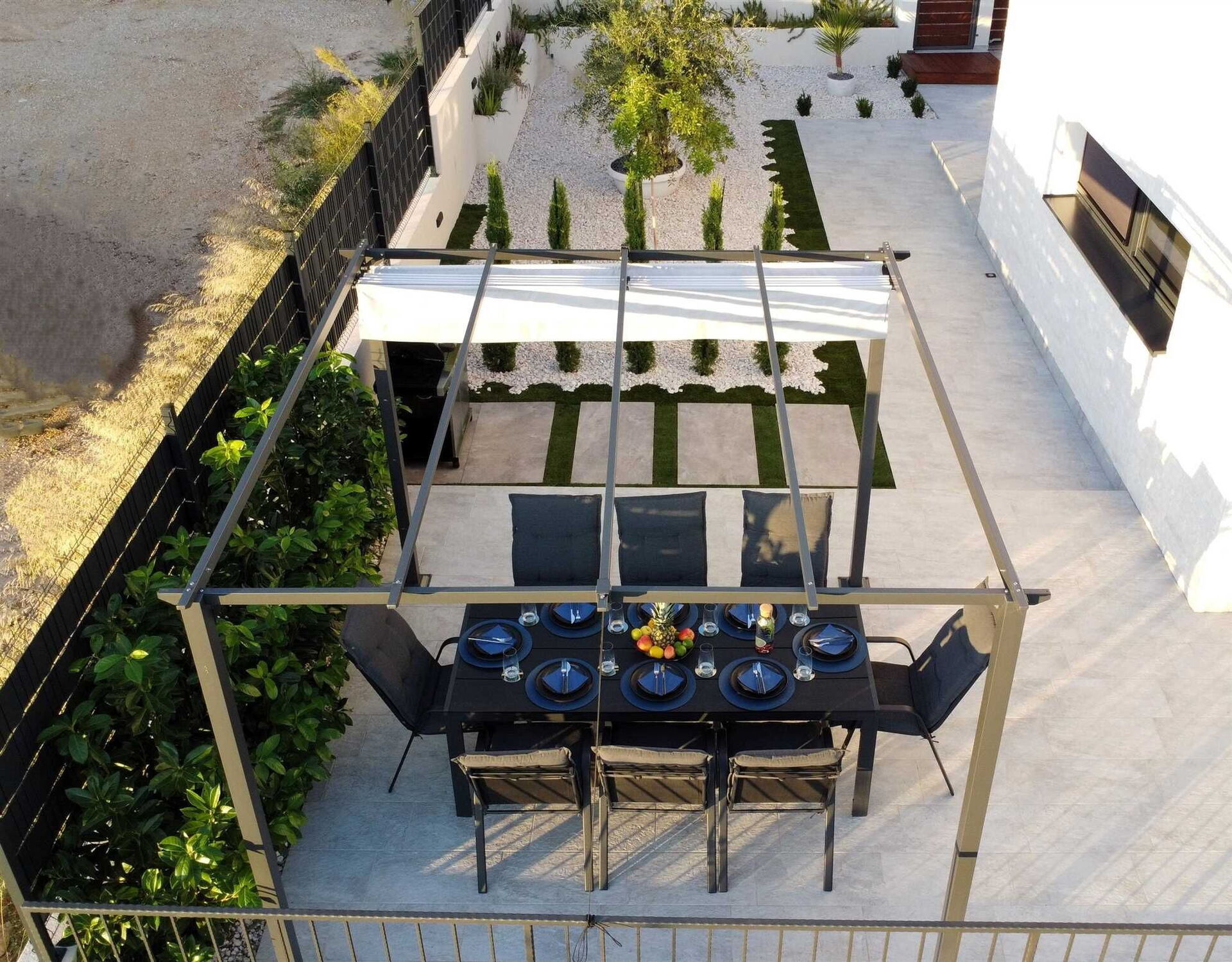 - Stor uteplass med lysthus med bord og stoler