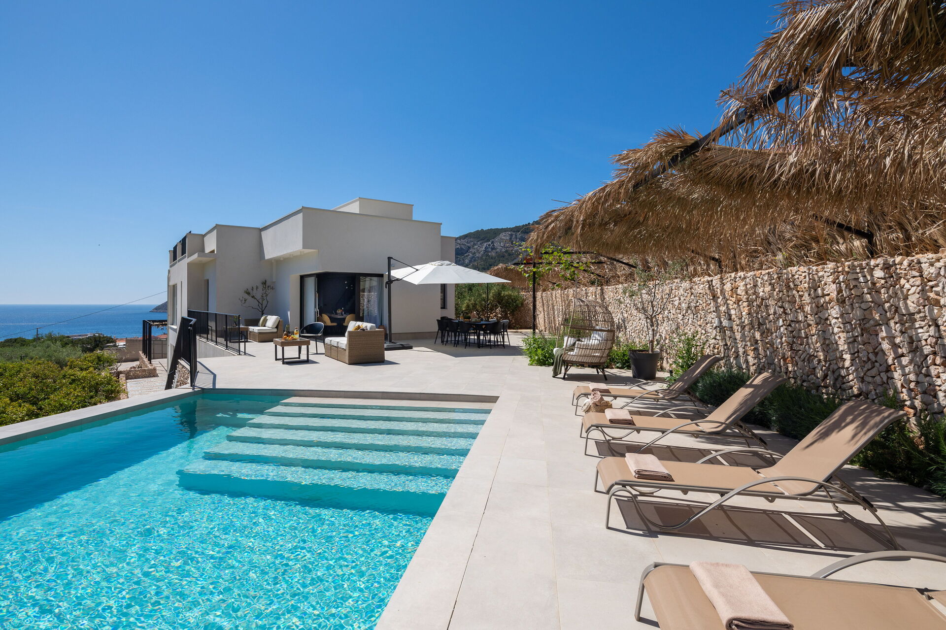 Villa Vivere er et luksushus på to etasjer med store, lyse rom utstyrt med alle fasiliteter. Uteområdet med et elegant oppvarmet basseng er også tilgjengelig via utvendig trapp.