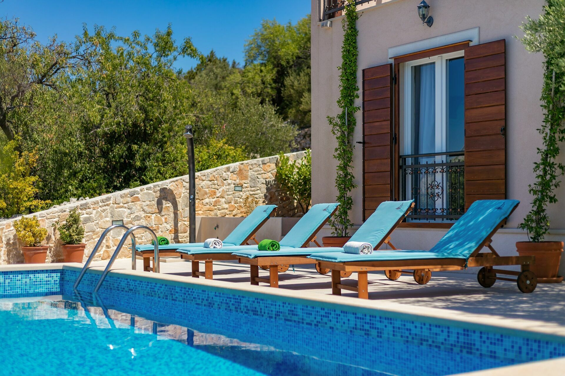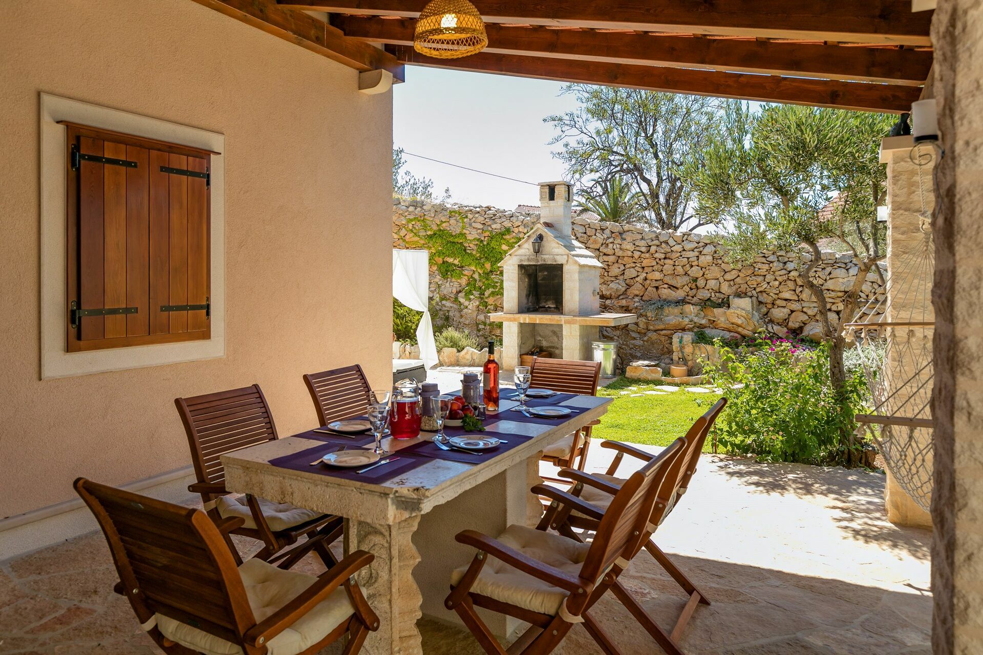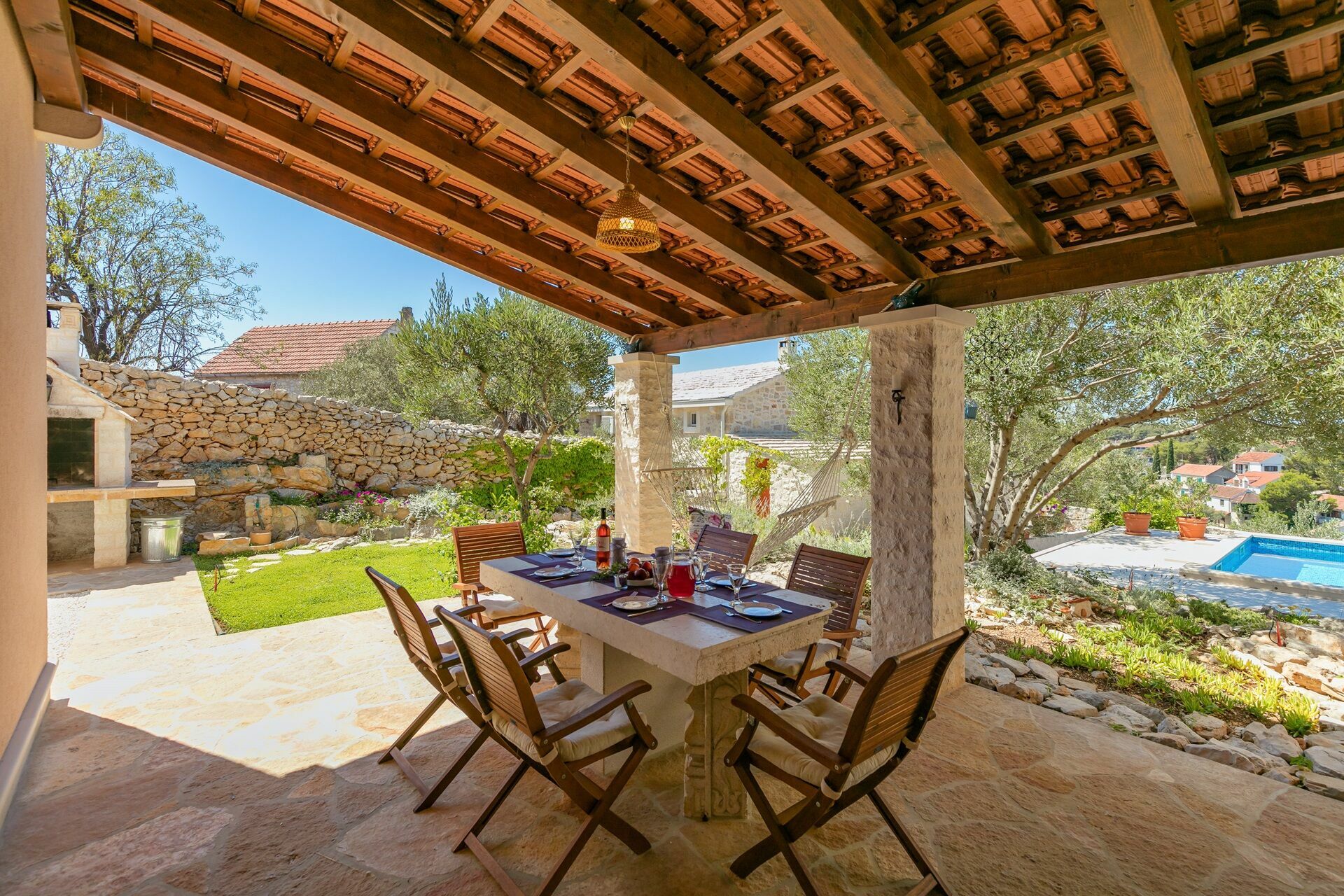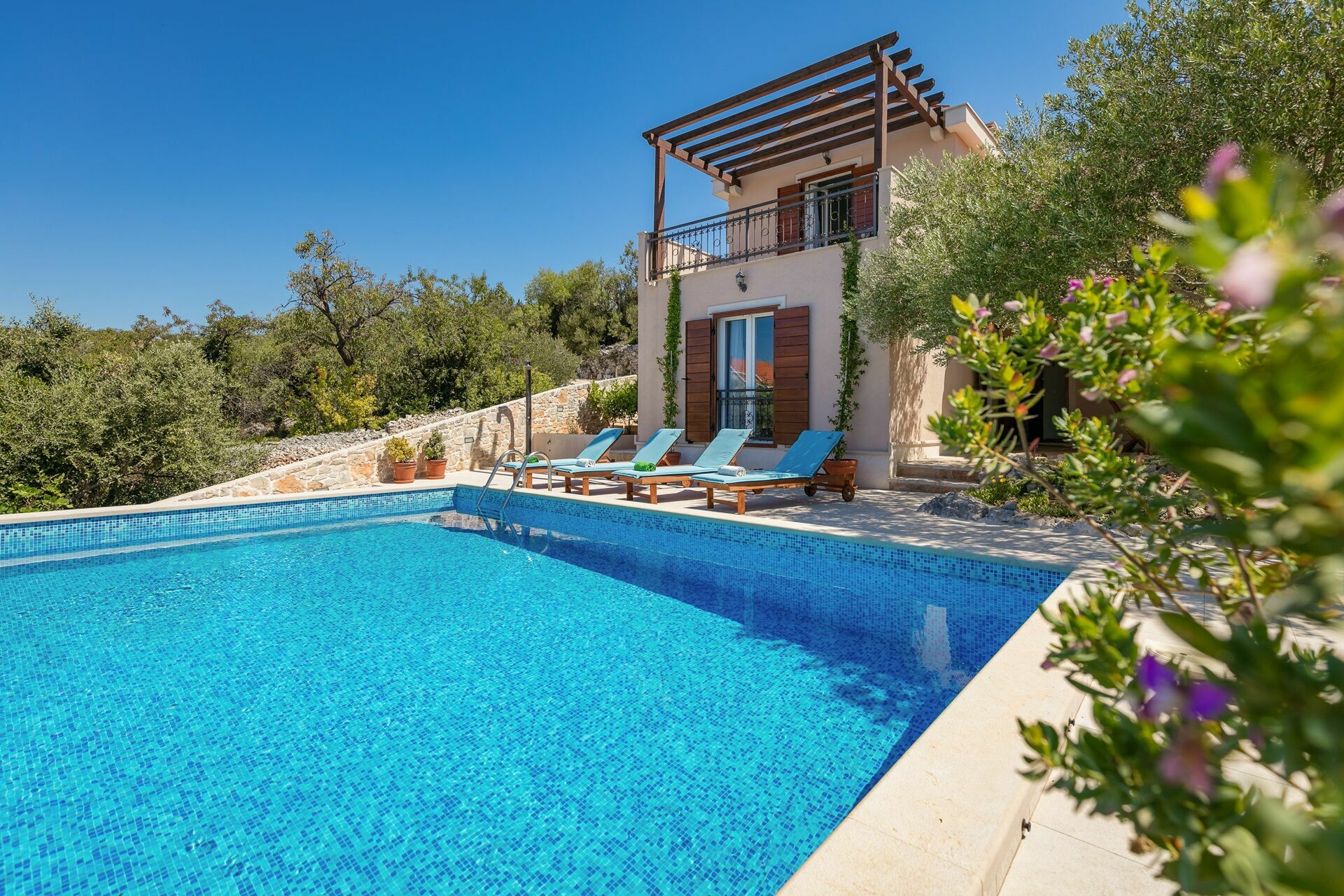 Feriehuset er omgitt av en nydelig hage på flere plan med et privat basseng med solsenger og parasoller: det perfekte stedet for å slappe av sammen med familie eller venner. Under en portico er det en spiseplass hvor du kan nyte måltider utendørs med en fantastisk utsikt over Milna-bukten i bakgrunnen.