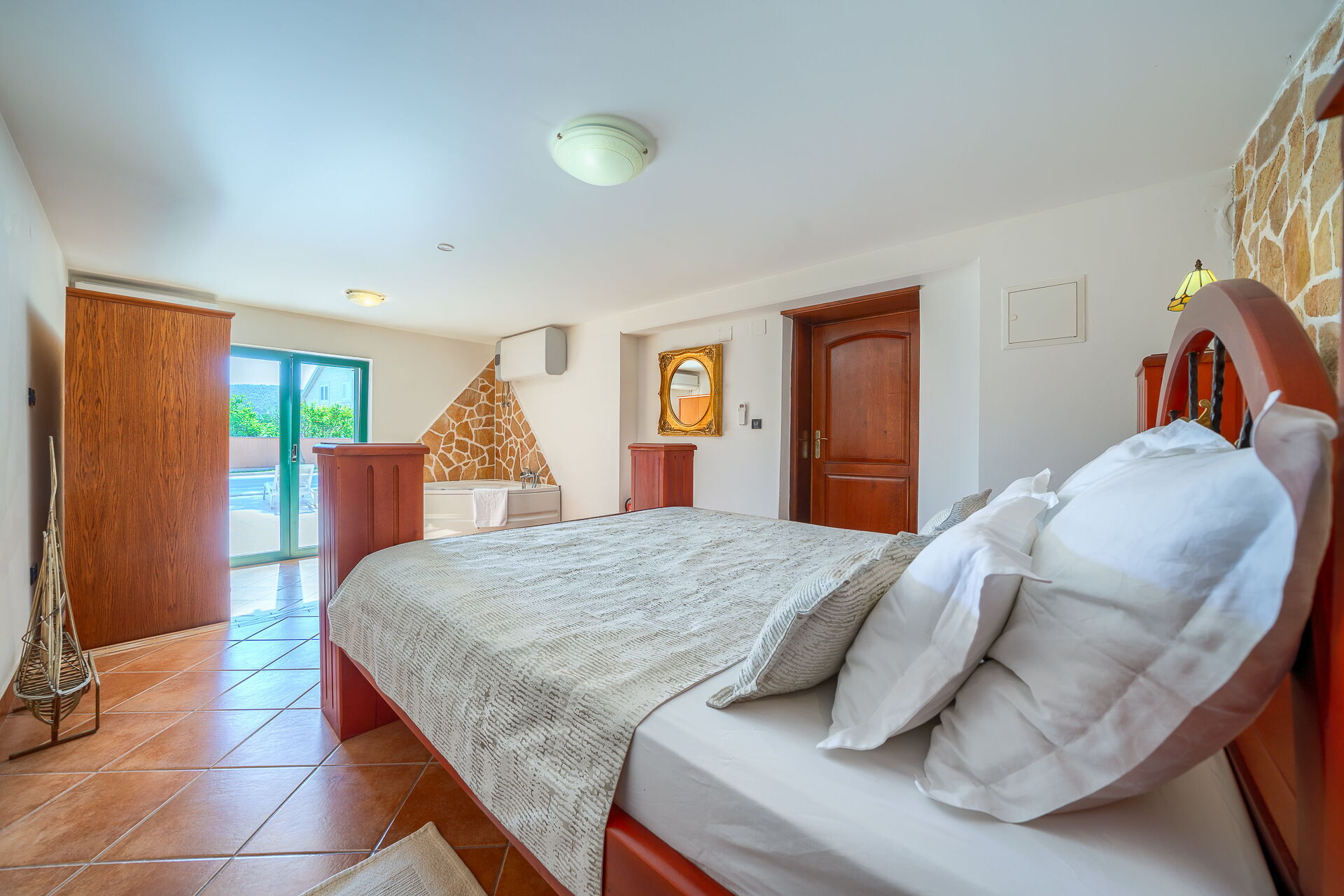 Første etasje: 1 dobbelt soverom med boblebad på rommet; 1 dobbelt soverom; 1 soverom med 2 dobbeltsenger; 1 bad med badekar; vaskerom. Alle soverommene har utgang.