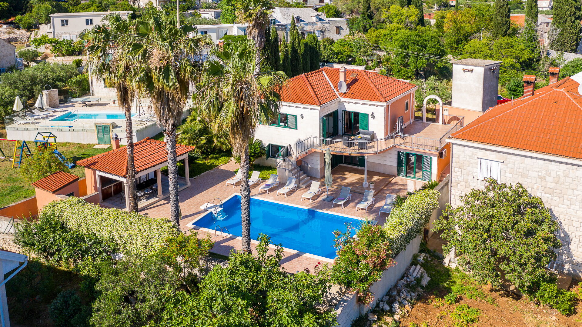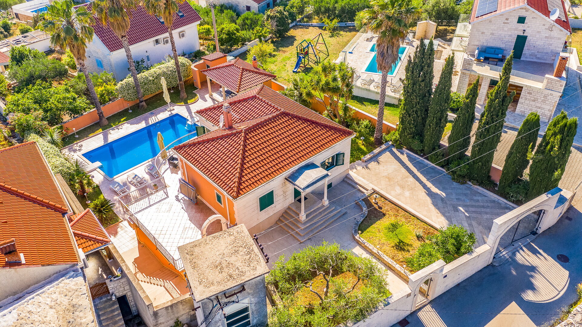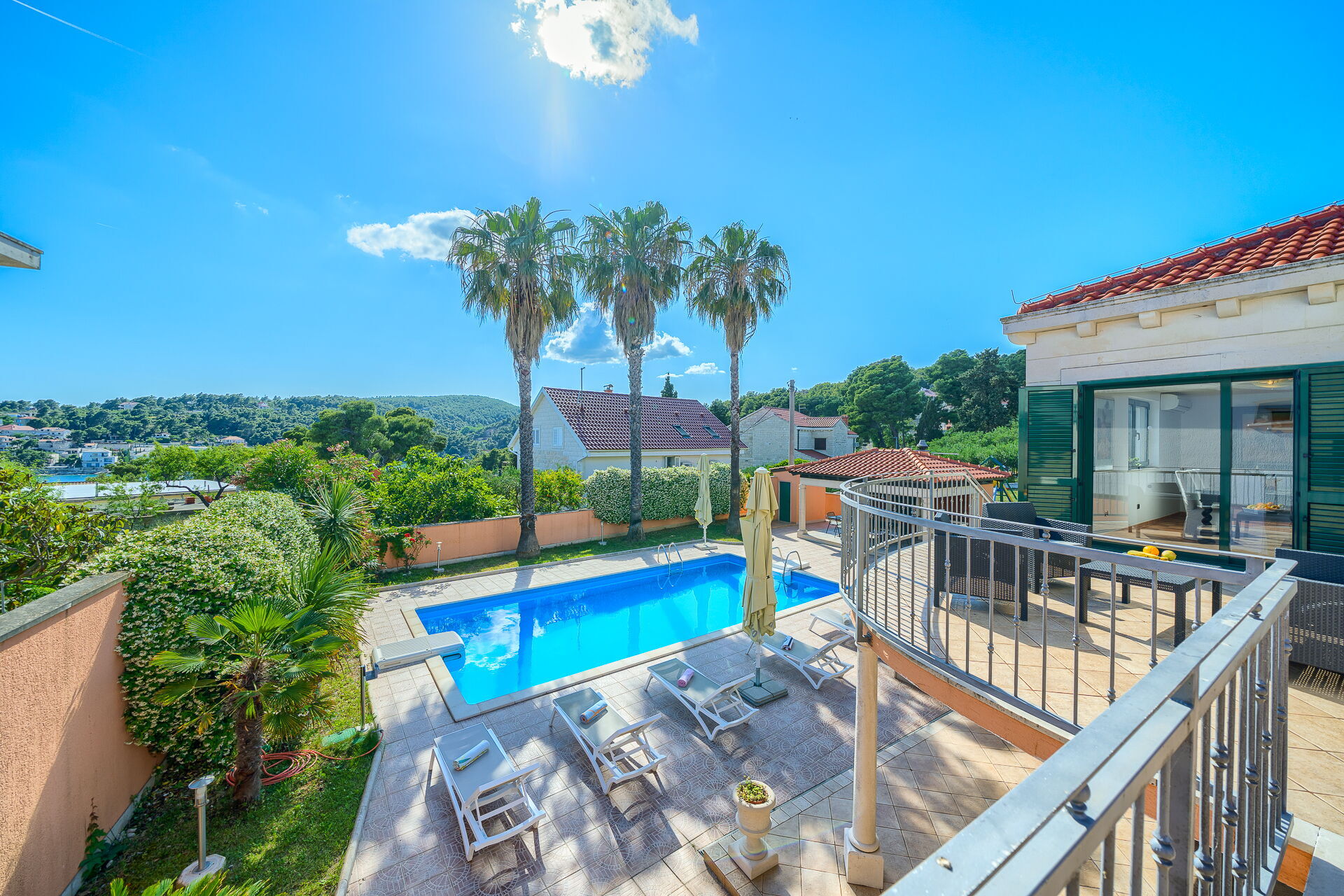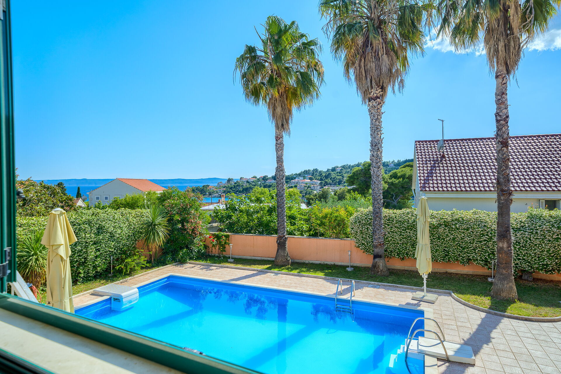 På uteområdet er det en frodig hage med palmer og andre planter som er typisk for øya Brac. En solterrasse med parasoller og solsenger omgir det pene private bassenget. Her kan du slappe av og avkjøle deg sammen med venner eller familie. Det er også en overbygd terrasse med spiseplass og en nydelig grill hvor du kan nyte deilige måltider utendørs.
