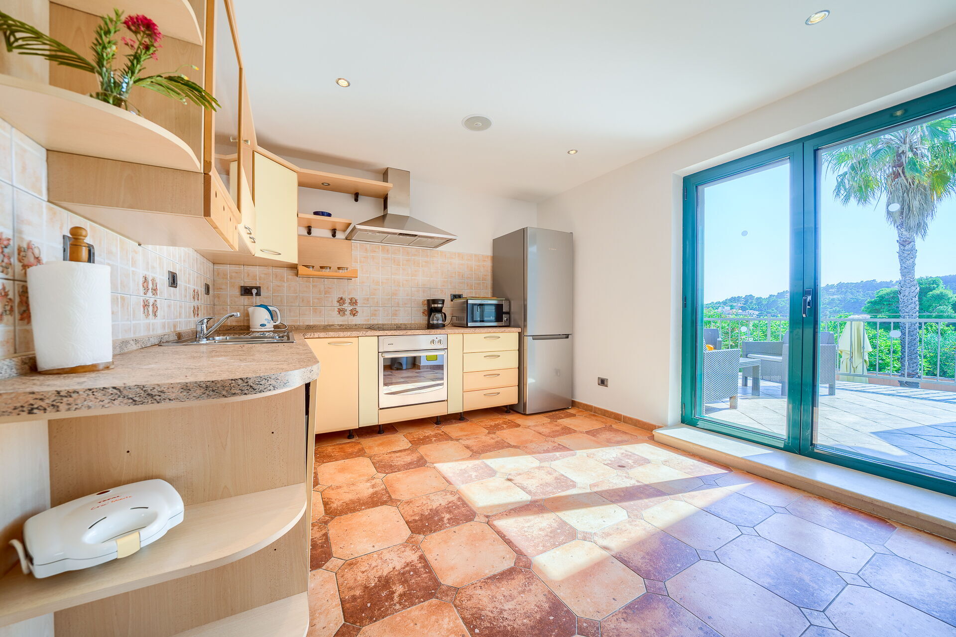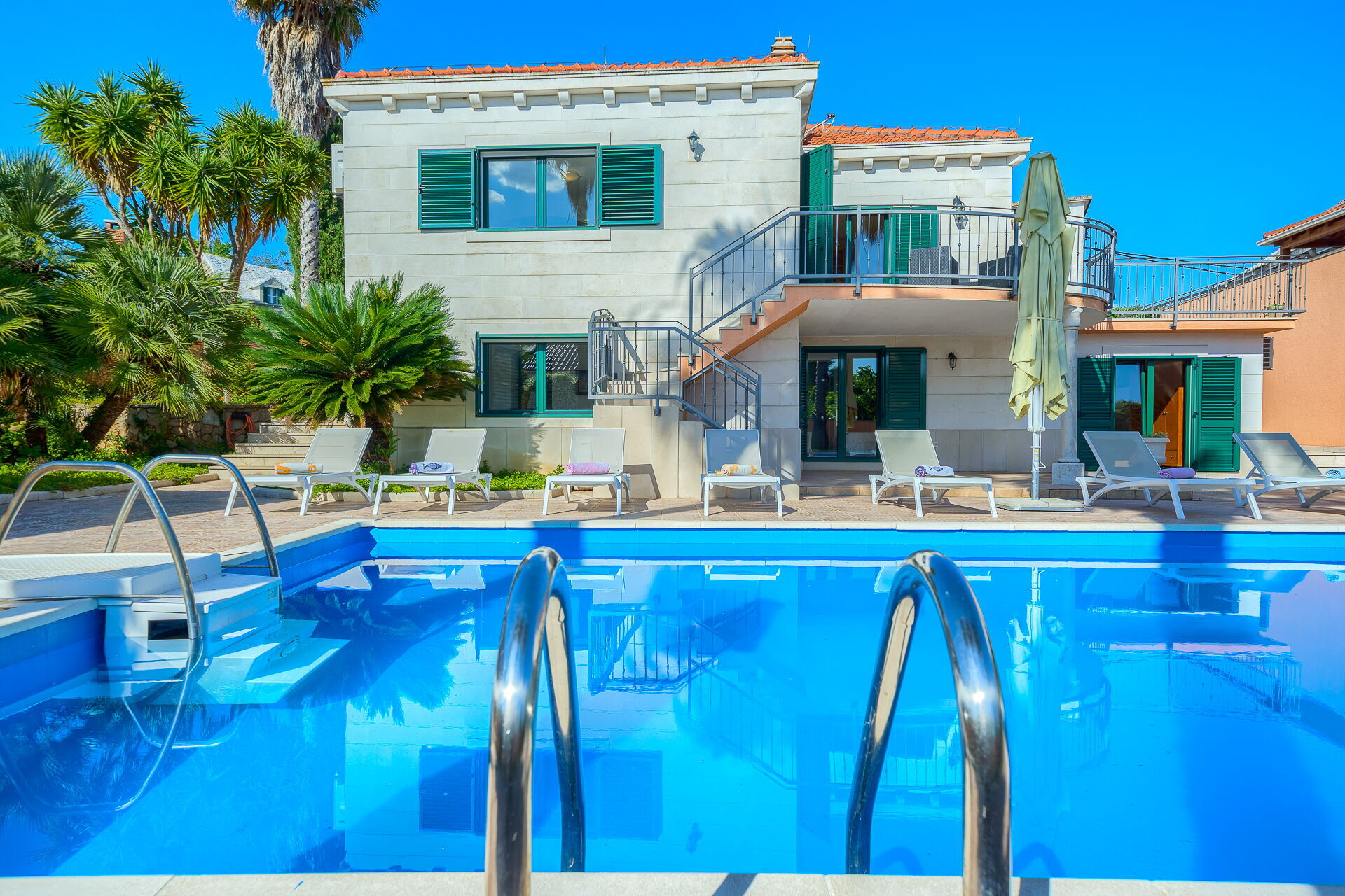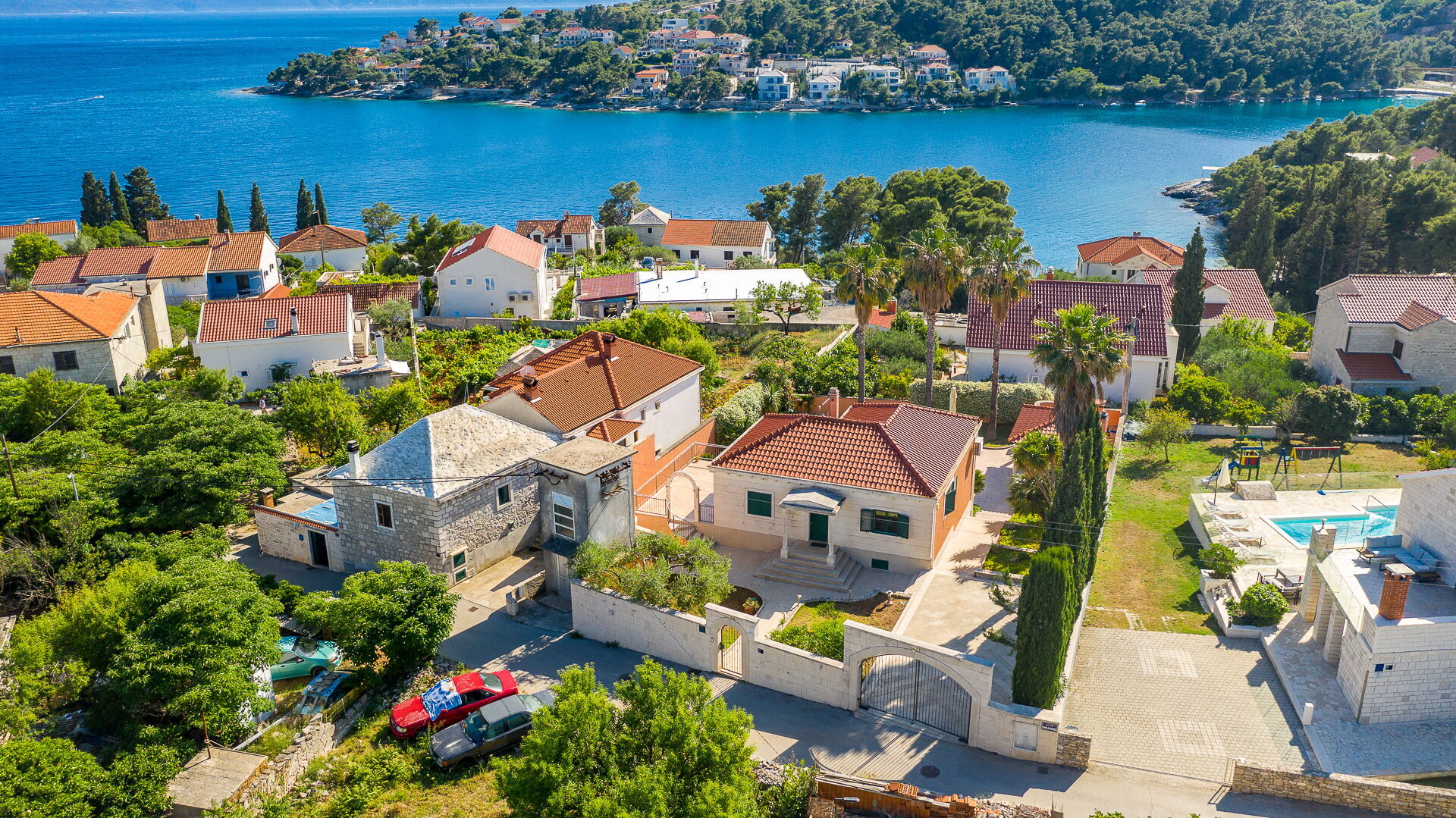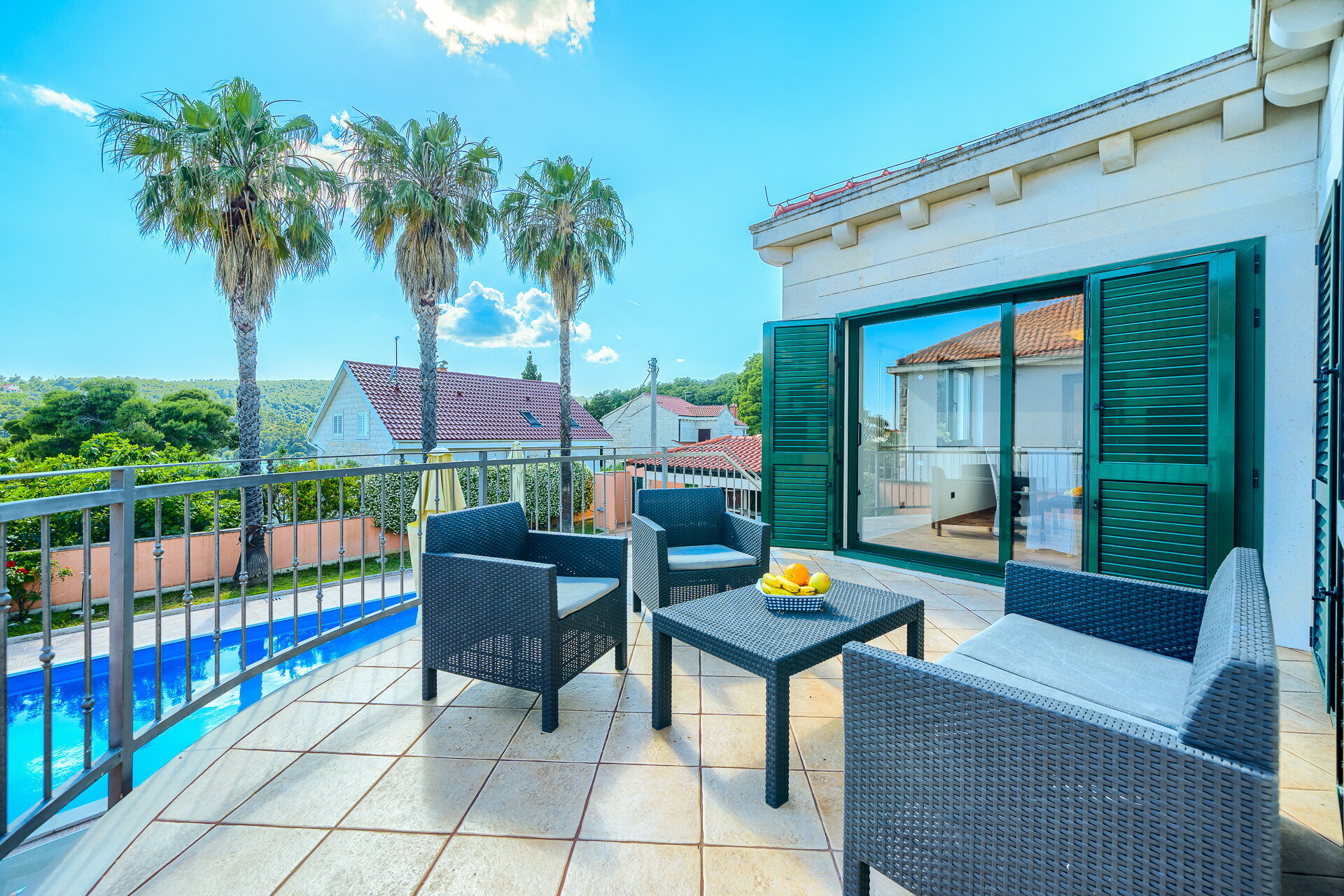 På uteområdet er det en frodig hage med palmer og andre planter som er typisk for øya Brac. En solterrasse med parasoller og solsenger omgir det pene private bassenget. Her kan du slappe av og avkjøle deg sammen med venner eller familie. Det er også en overbygd terrasse med spiseplass og en nydelig grill hvor du kan nyte deilige måltider utendørs.