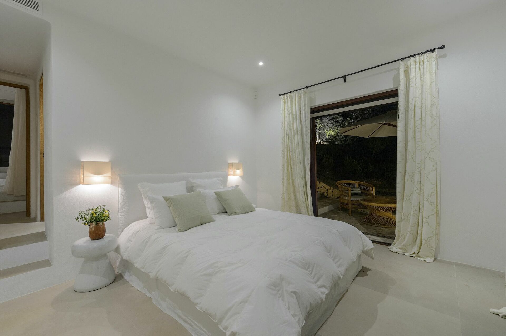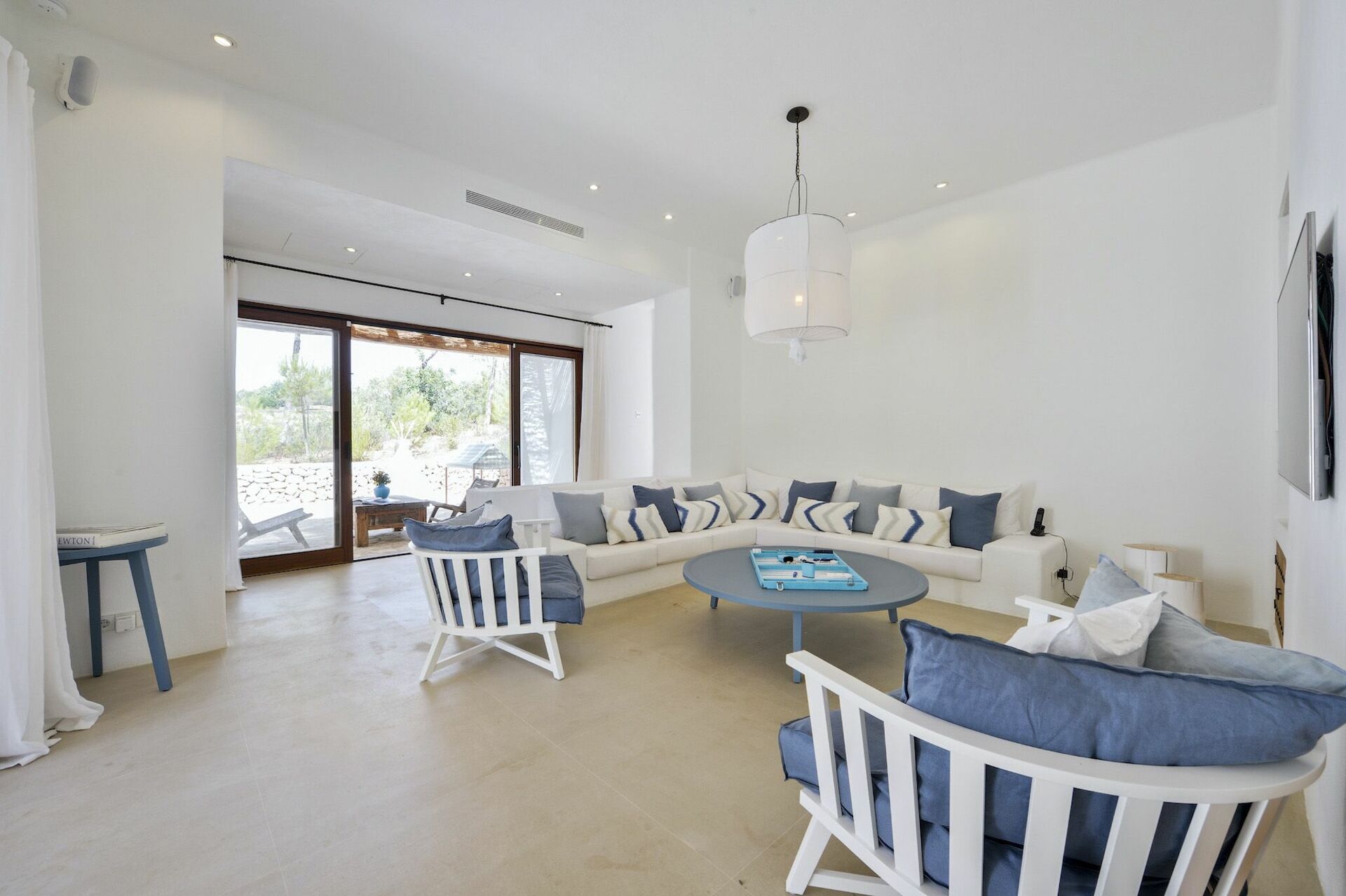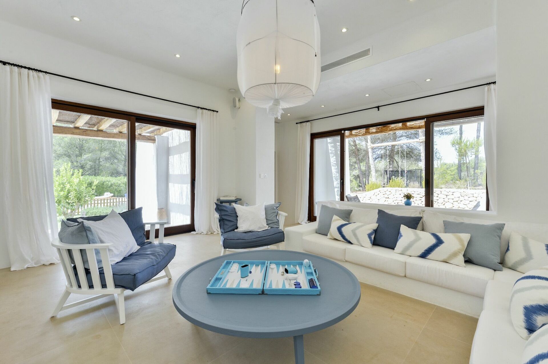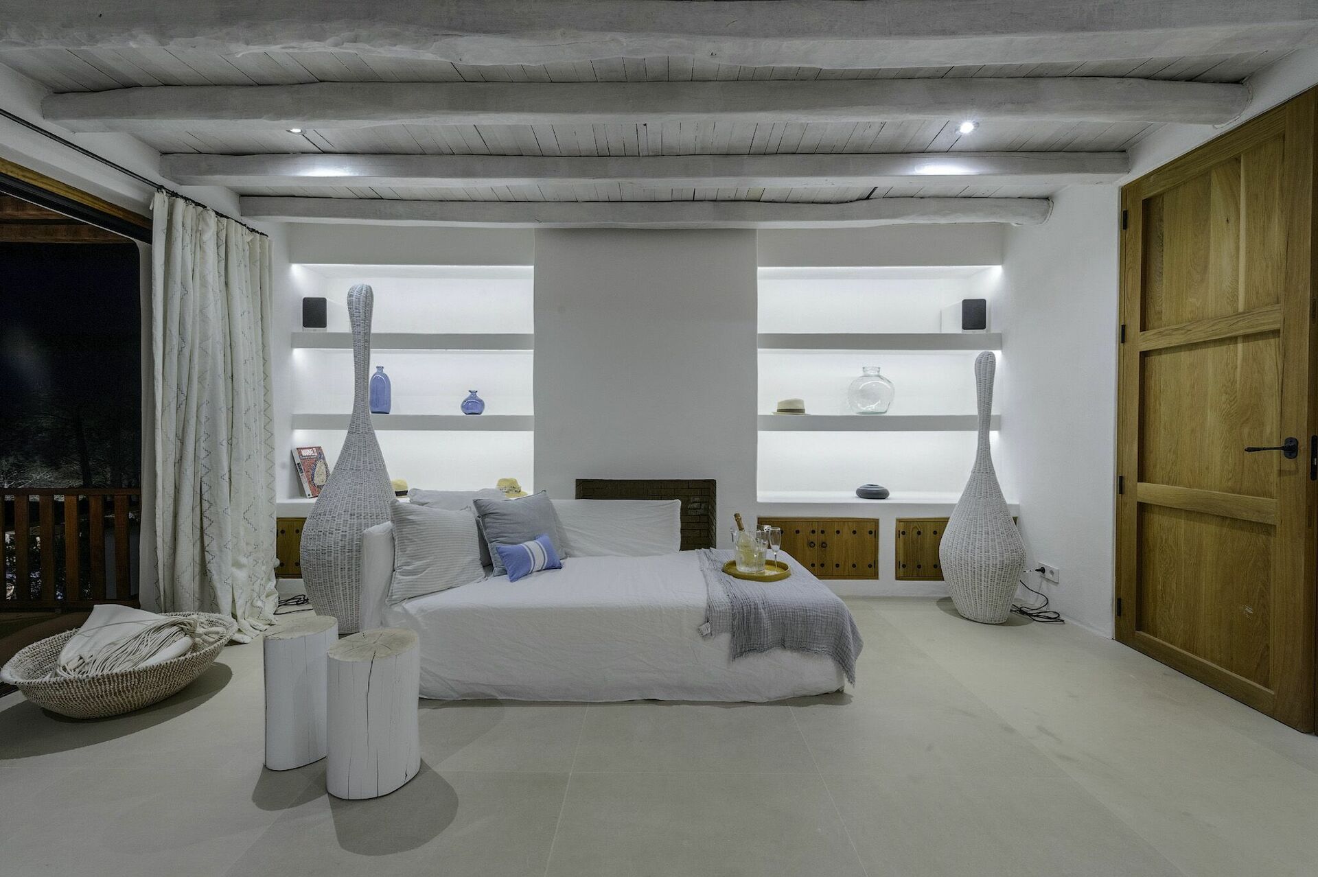 Innvendig spenner huset seg over to etasjer og har plass til opptil 10 personer fordelt på 5 soverom. Hvert soverom har eget bad, stor garderobe og klimaanlegg. Fellesarealene er smakfullt innredet i karakteristisk stil for Ibiza, og utstyrt med de beste fasiliteter for å kunne gi deg mest mulig luksus og komfort. I huset er det er et treningsrom, kino rom og kjøkken fullt utstyrt med de mest moderne husholdningsapparater.
