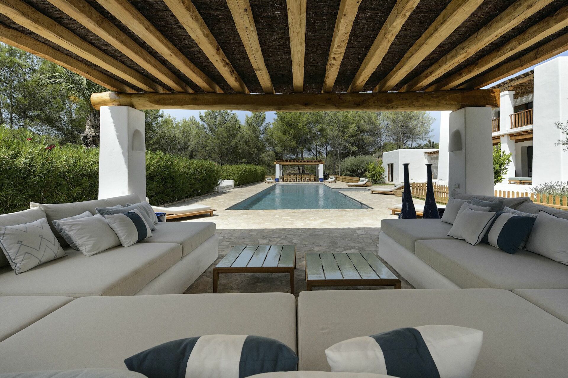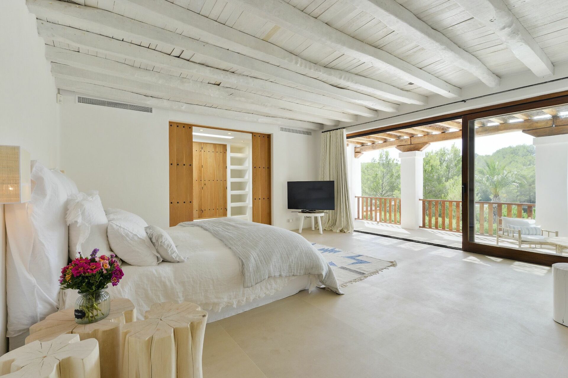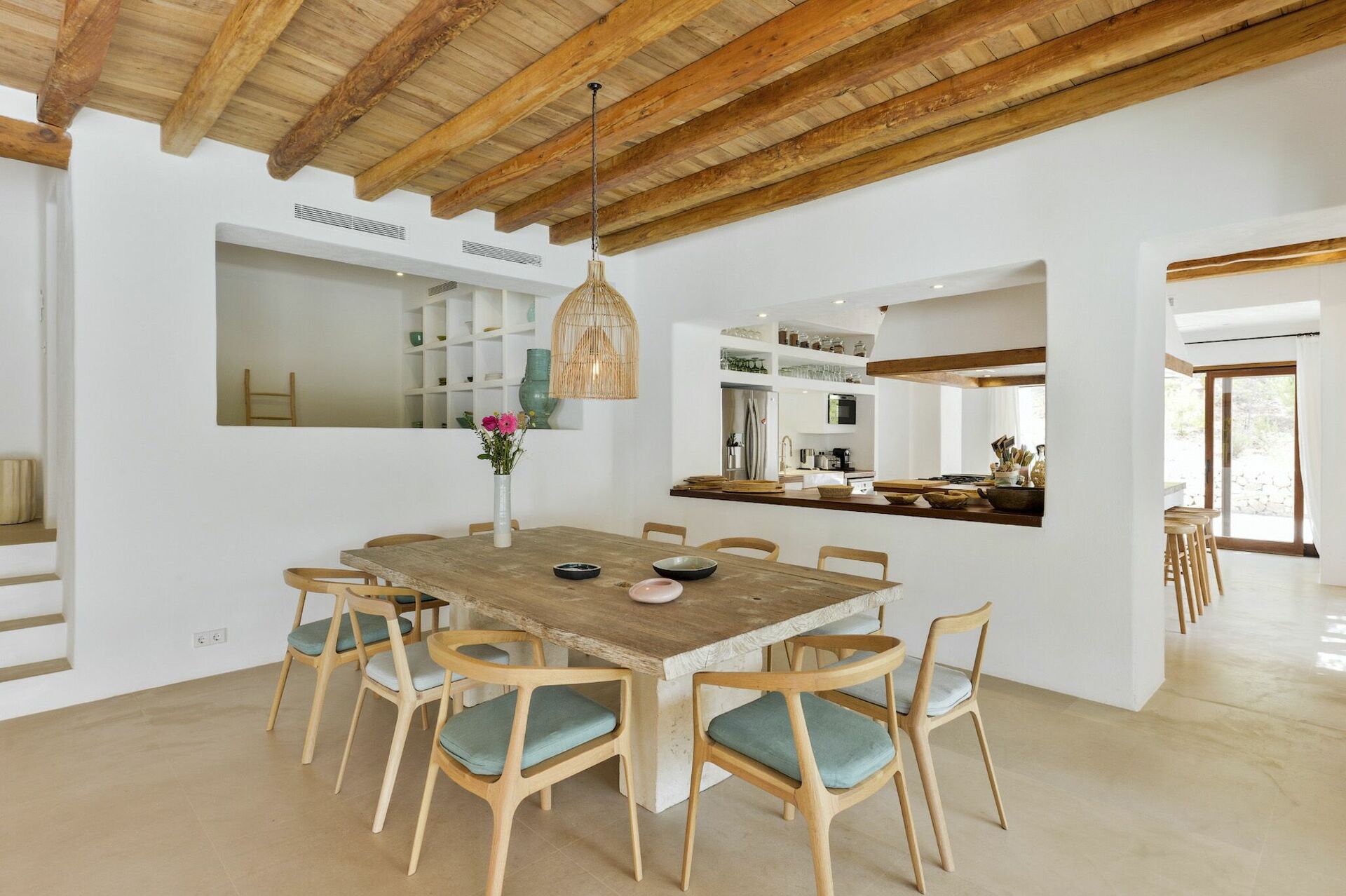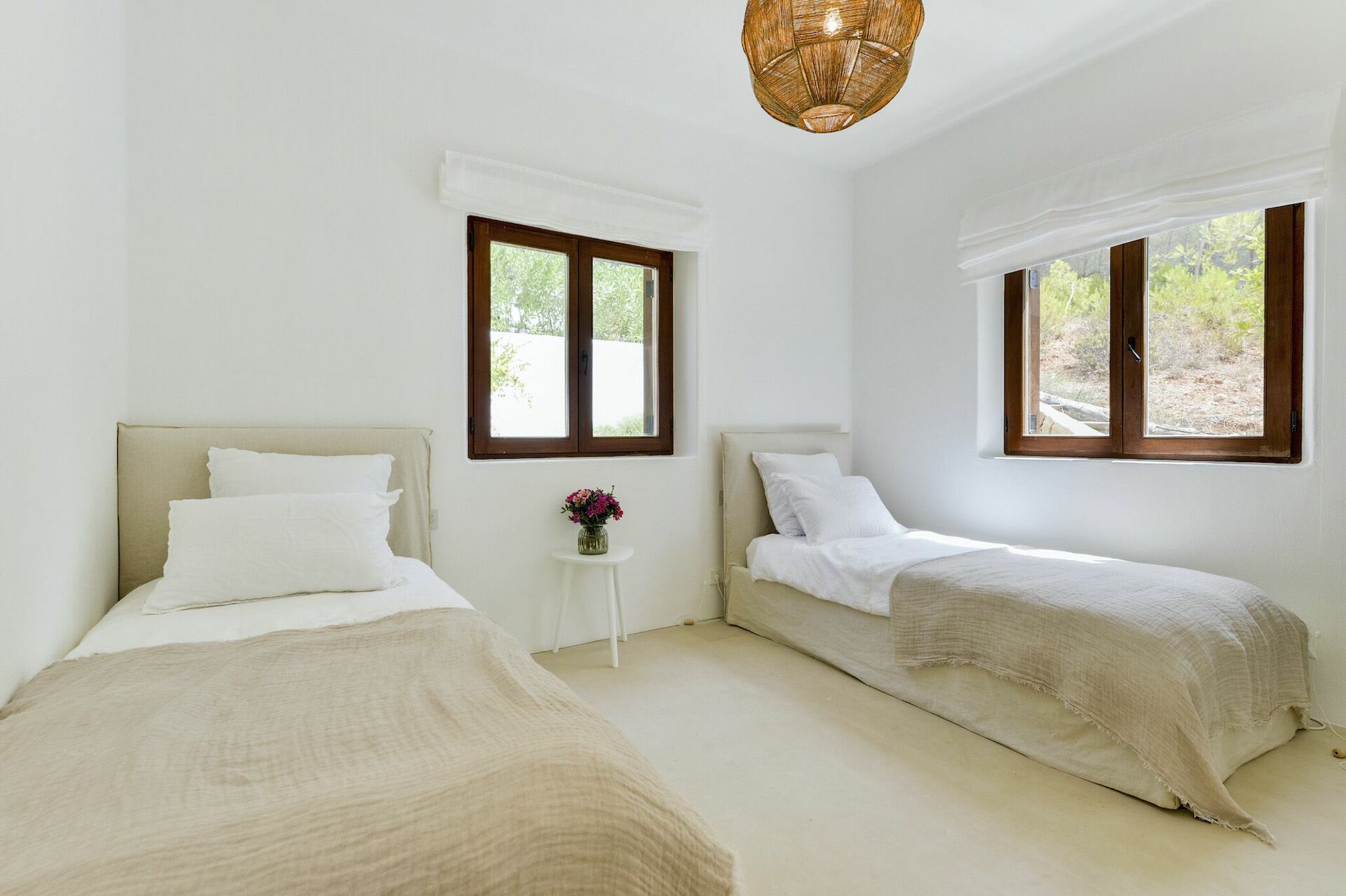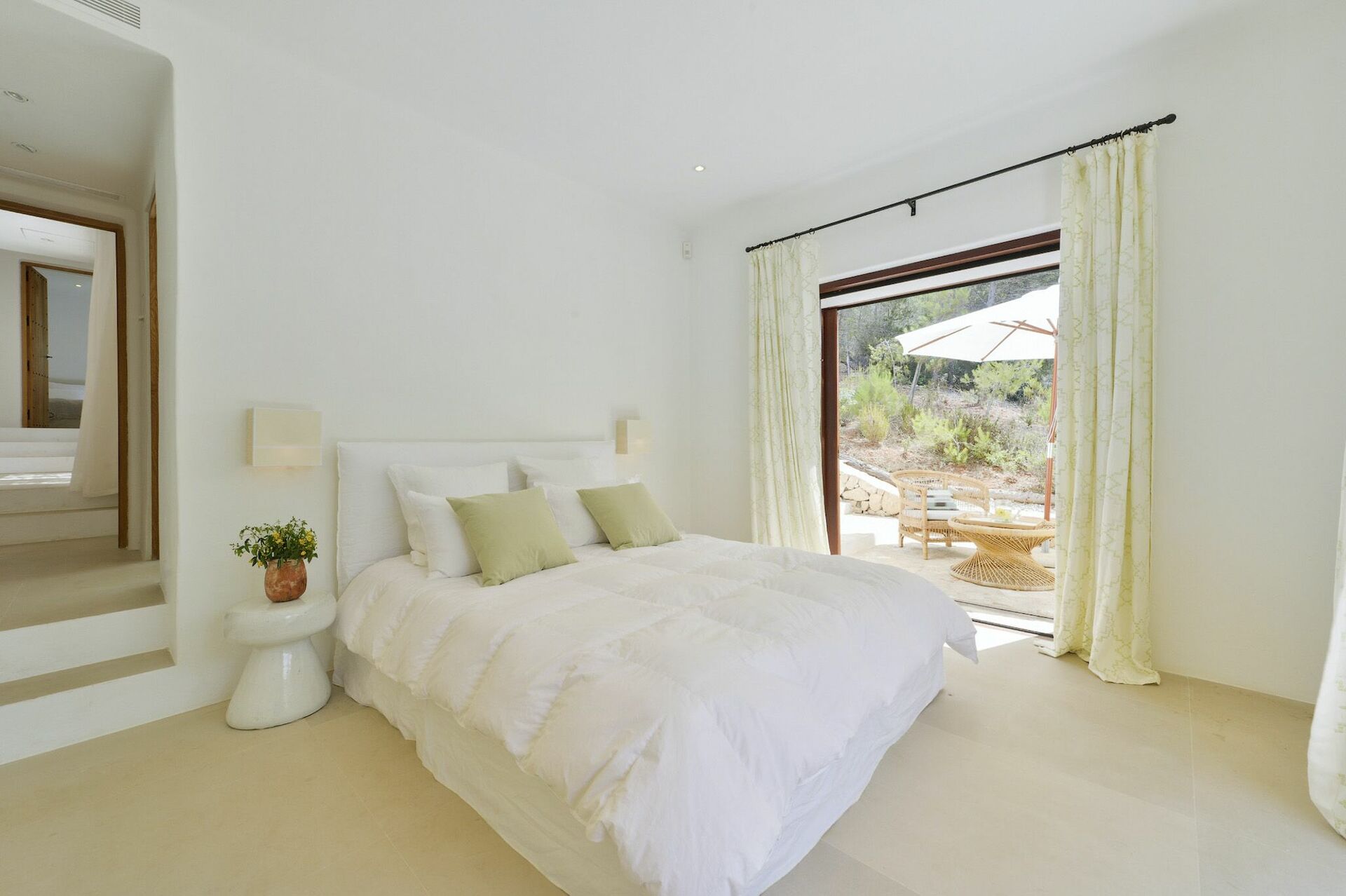 Innvendig spenner huset seg over to etasjer og har plass til opptil 10 personer fordelt på 5 soverom. Hvert soverom har eget bad, stor garderobe og klimaanlegg. Fellesarealene er smakfullt innredet i karakteristisk stil for Ibiza, og utstyrt med de beste fasiliteter for å kunne gi deg mest mulig luksus og komfort. I huset er det er et treningsrom, kino rom og kjøkken fullt utstyrt med de mest moderne husholdningsapparater.