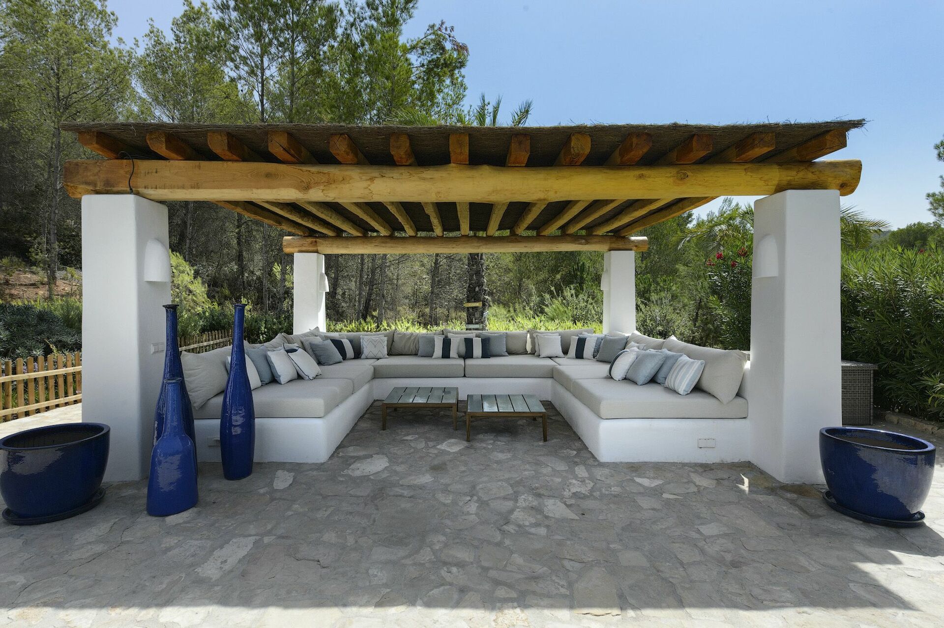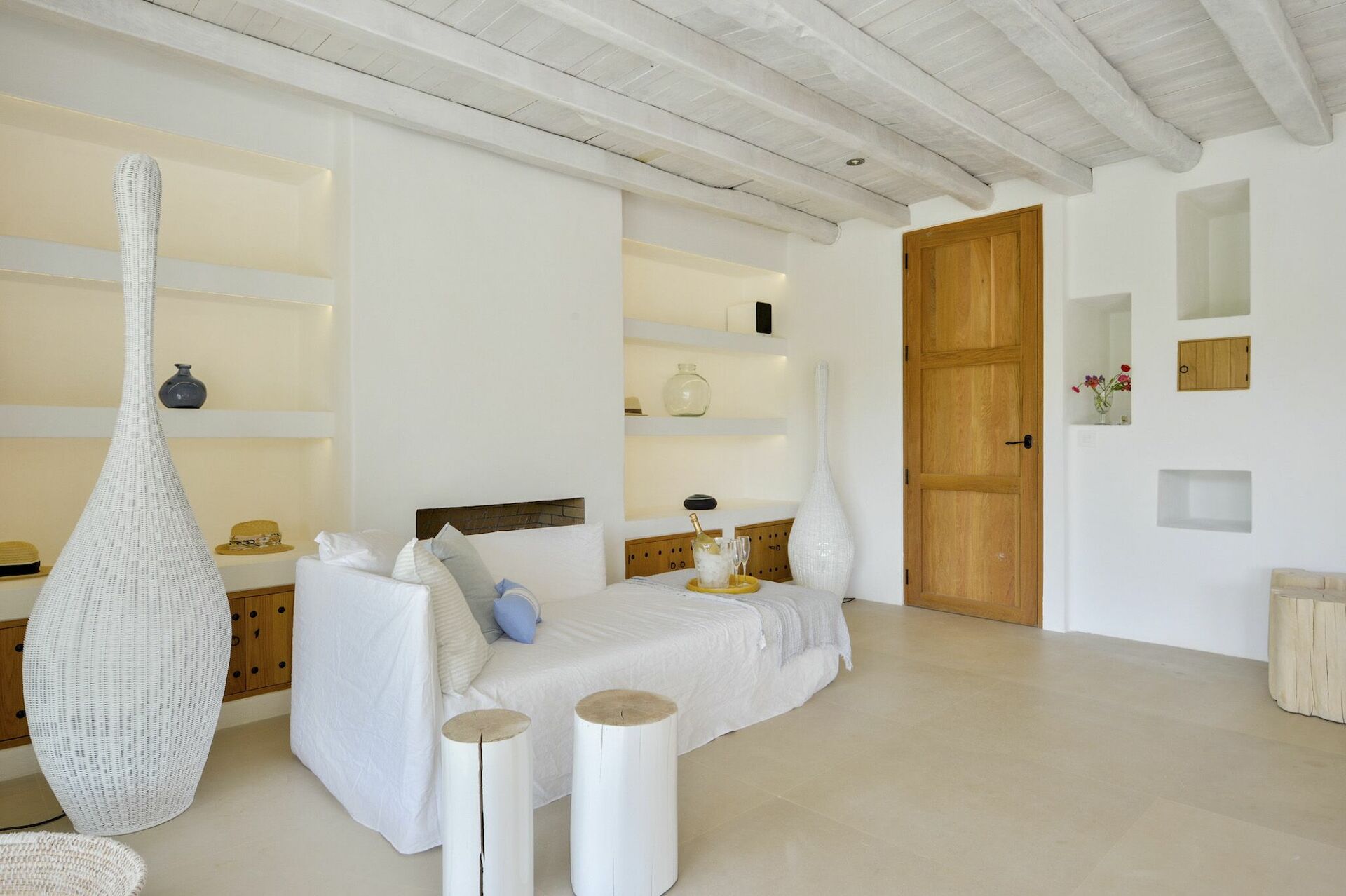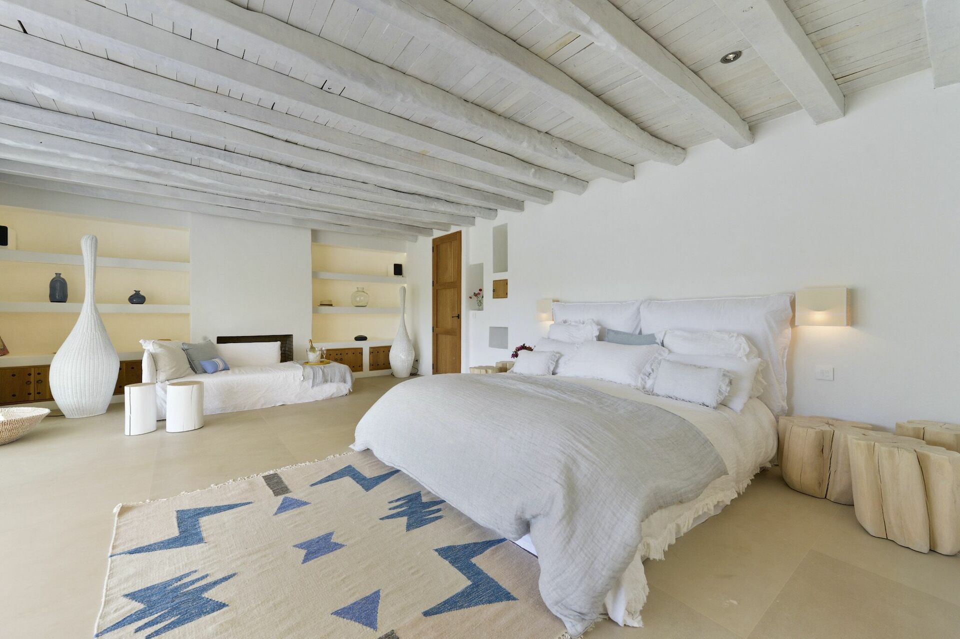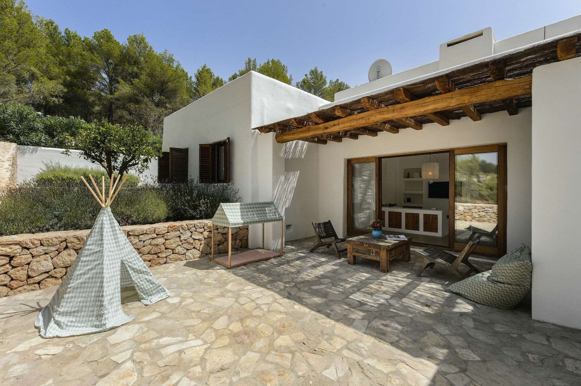 Innvendig spenner huset seg over to etasjer og har plass til opptil 10 personer fordelt på 5 soverom. Hvert soverom har eget bad, stor garderobe og klimaanlegg. Fellesarealene er smakfullt innredet i karakteristisk stil for Ibiza, og utstyrt med de beste fasiliteter for å kunne gi deg mest mulig luksus og komfort. I huset er det er et treningsrom, kino rom og kjøkken fullt utstyrt med de mest moderne husholdningsapparater.
