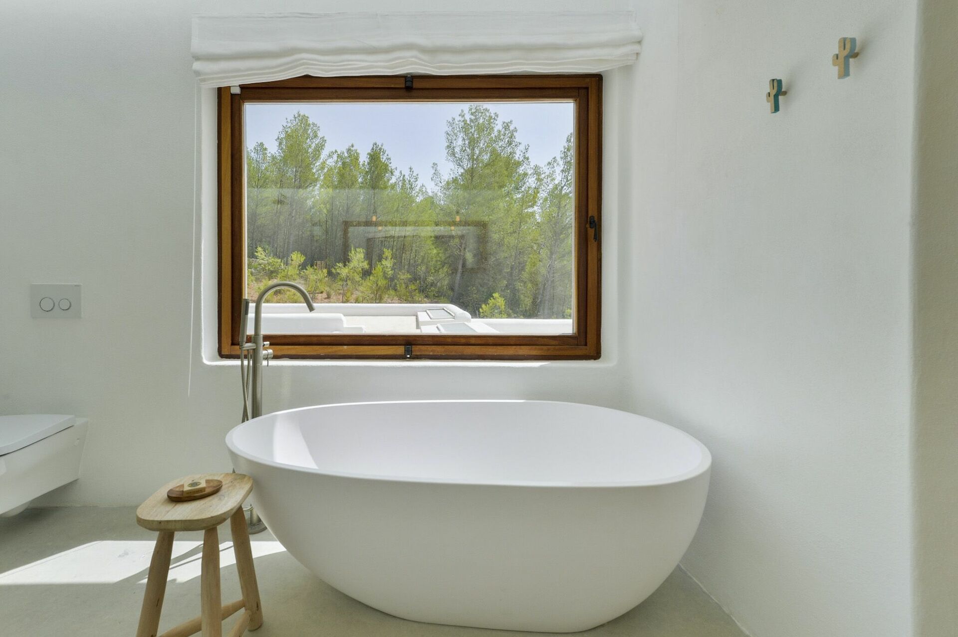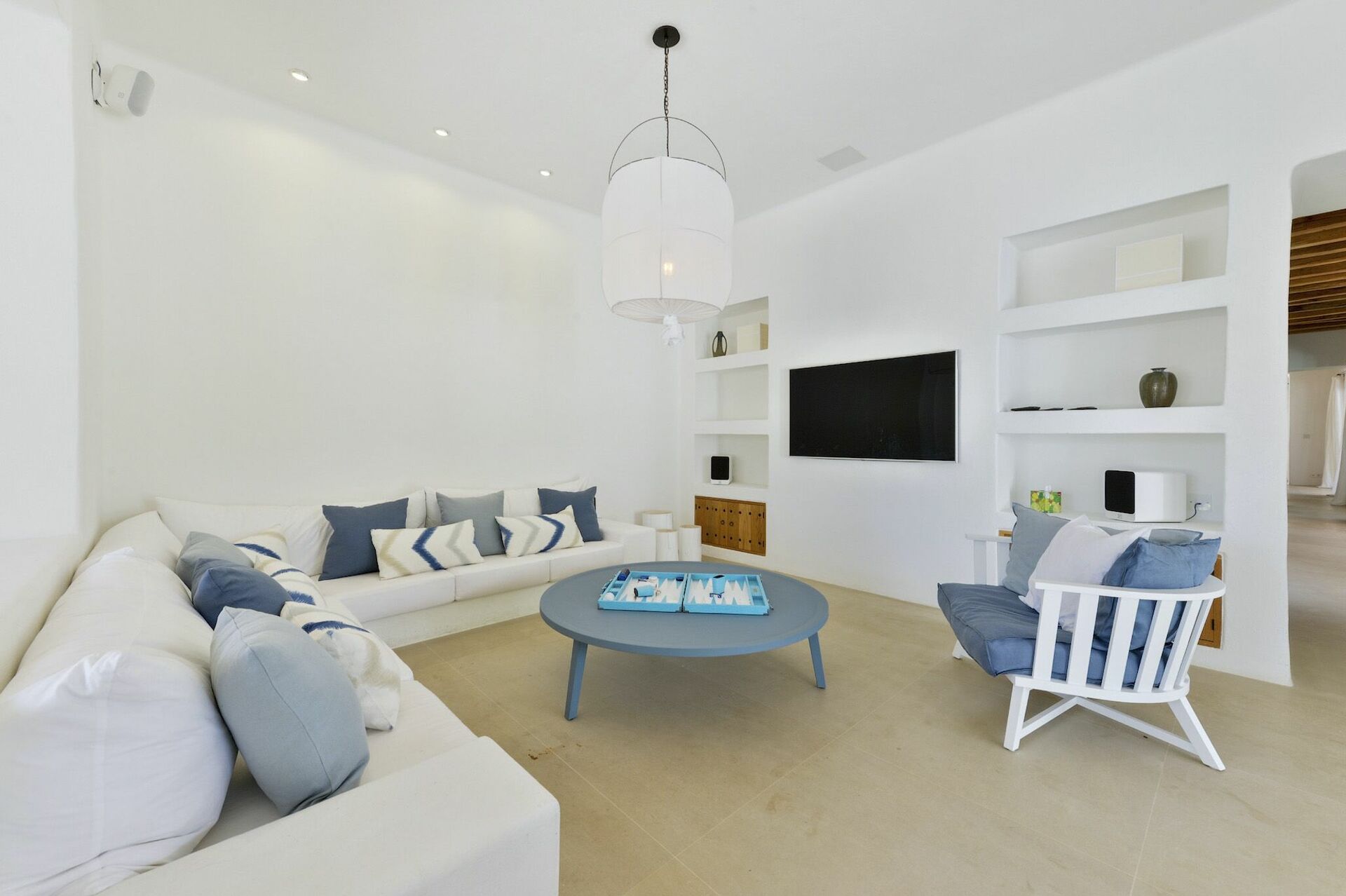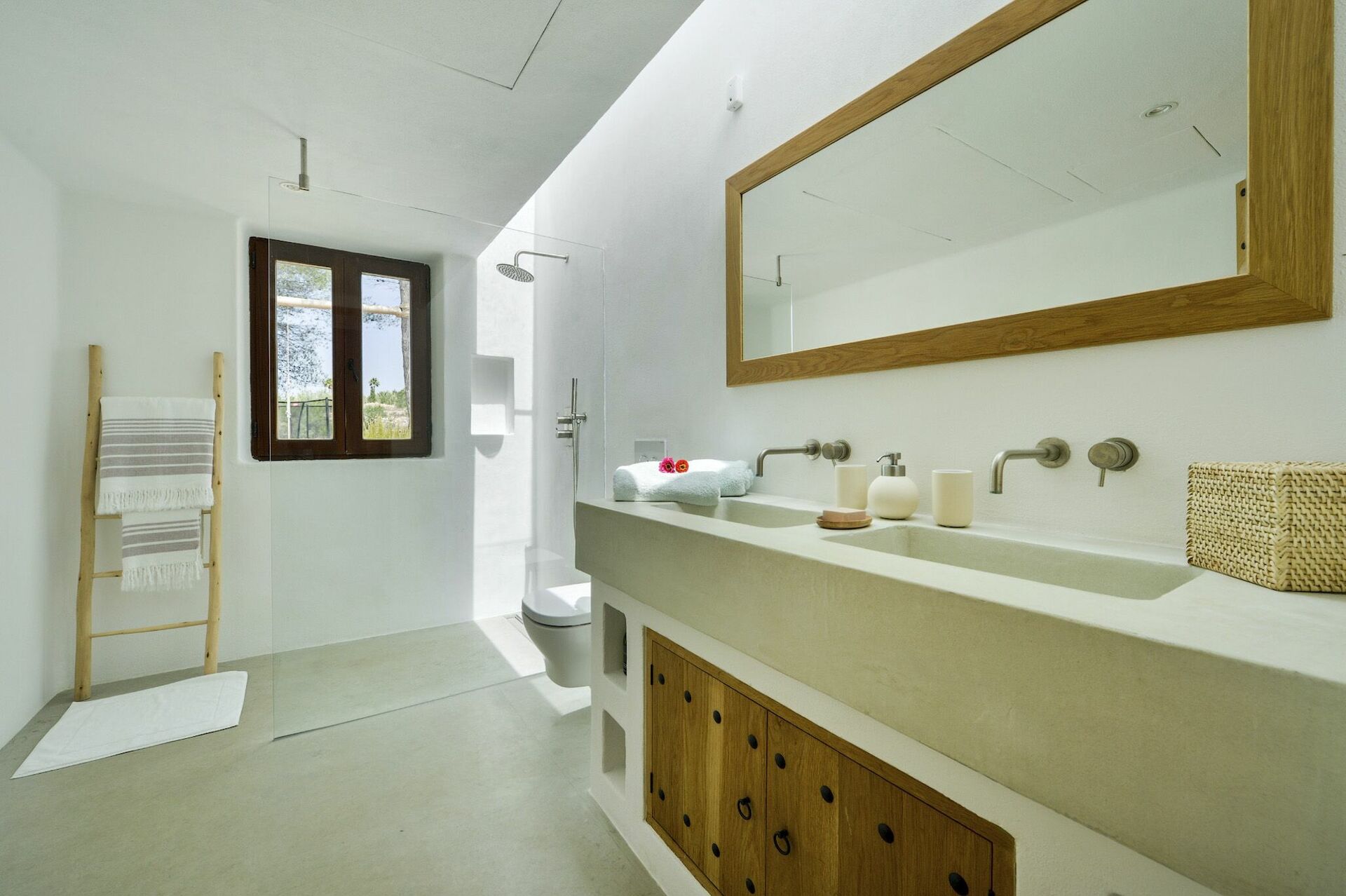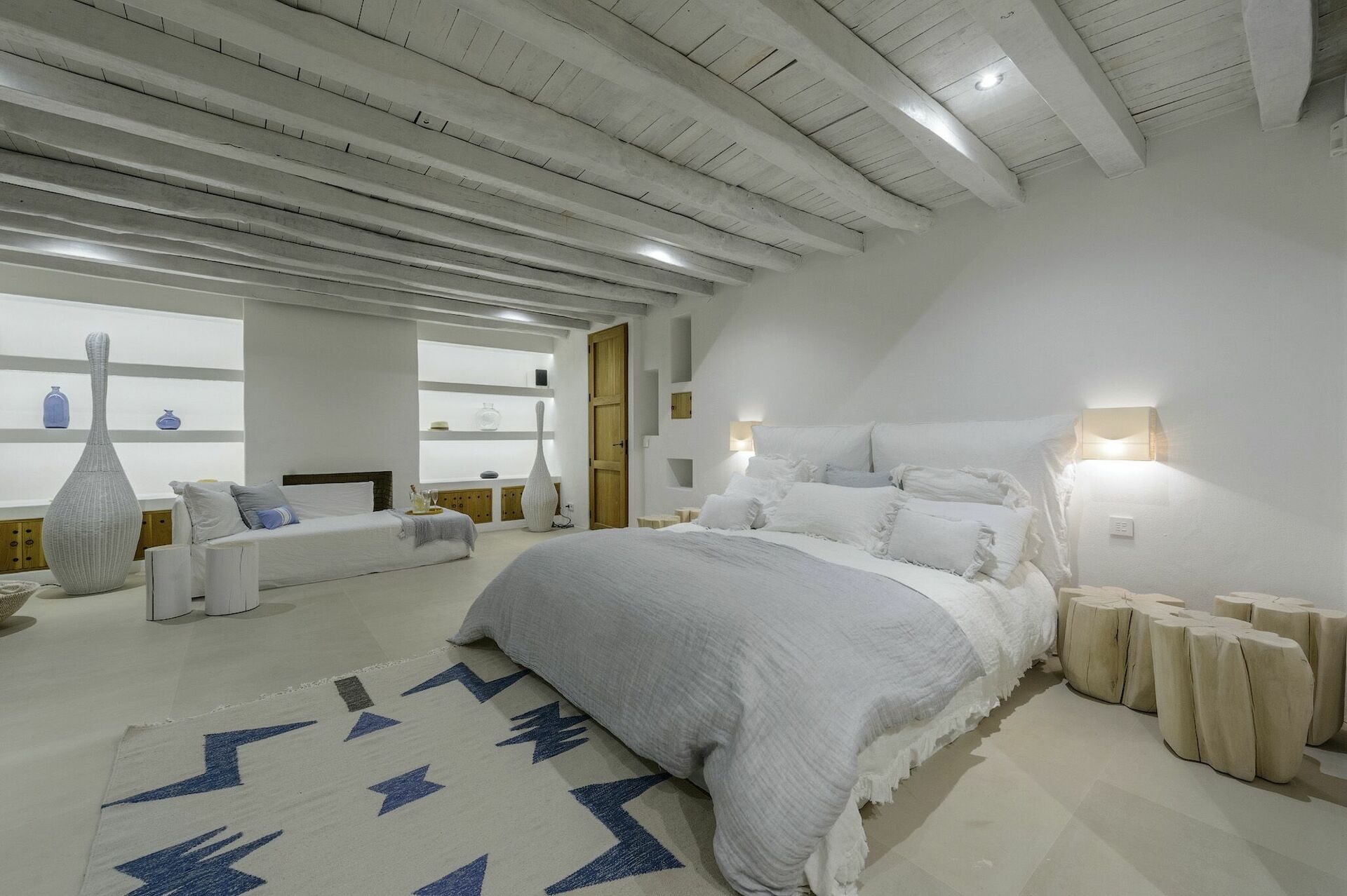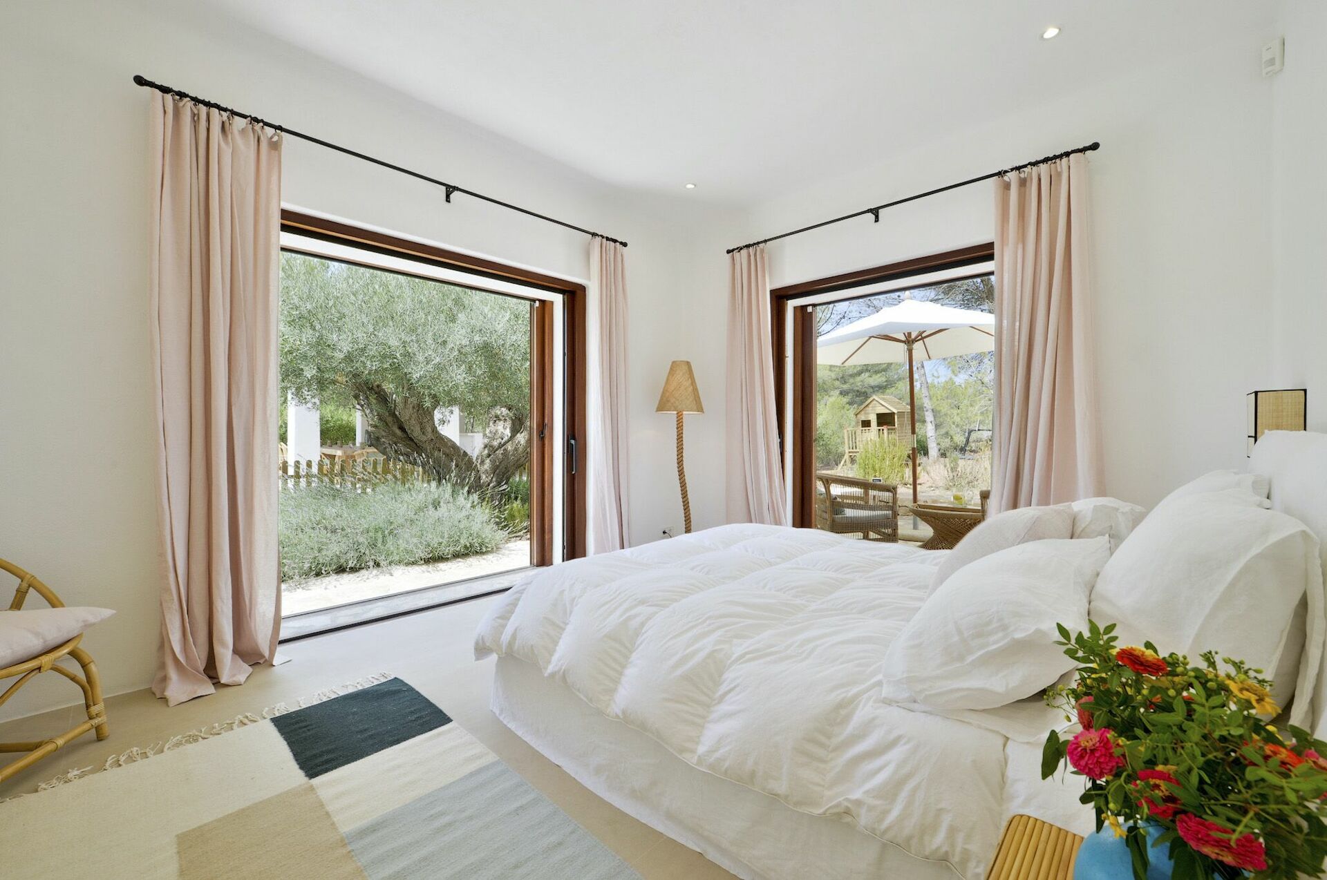 Innvendig spenner huset seg over to etasjer og har plass til opptil 10 personer fordelt på 5 soverom. Hvert soverom har eget bad, stor garderobe og klimaanlegg. Fellesarealene er smakfullt innredet i karakteristisk stil for Ibiza, og utstyrt med de beste fasiliteter for å kunne gi deg mest mulig luksus og komfort. I huset er det er et treningsrom, kino rom og kjøkken fullt utstyrt med de mest moderne husholdningsapparater.