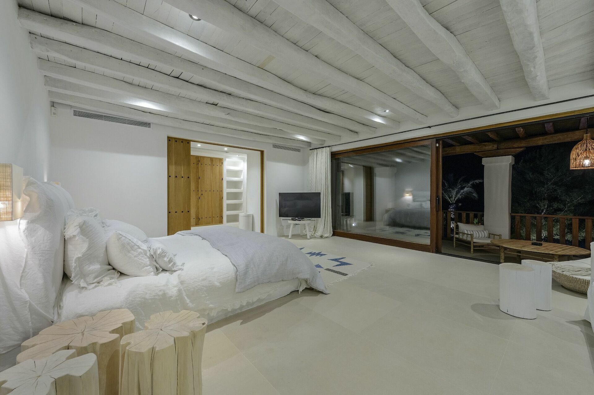 Andre etasje: hovedsoverom med king-size-seng, eget bad med dusj og badekar, walk-in closet og privat terrasse med utsikt over bassenget.