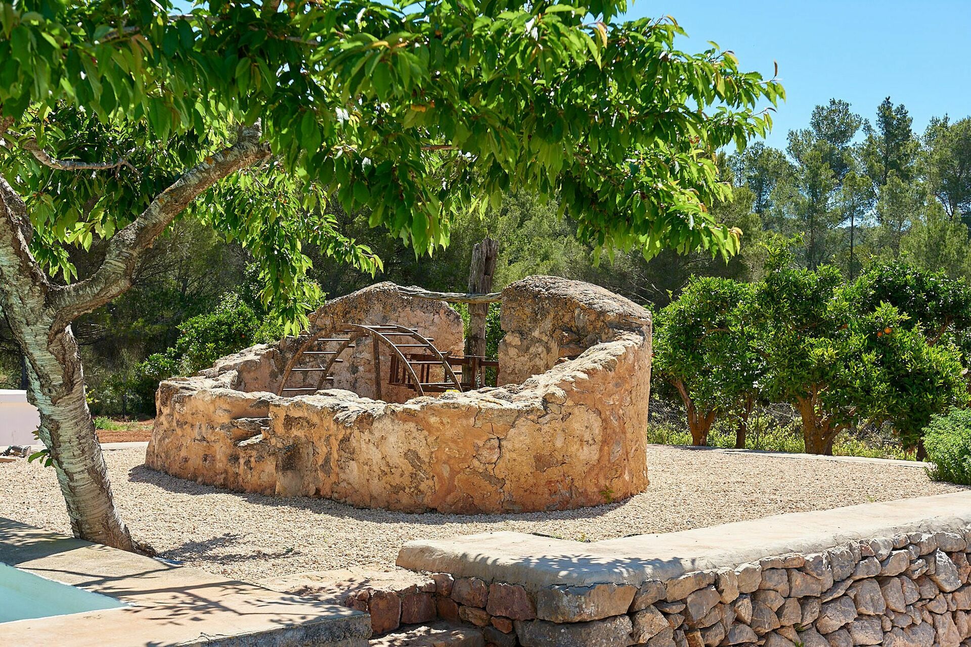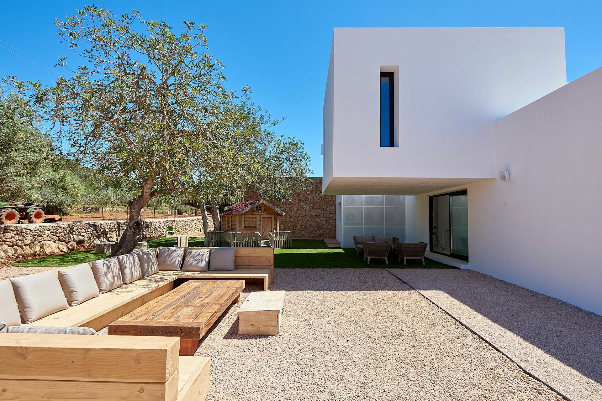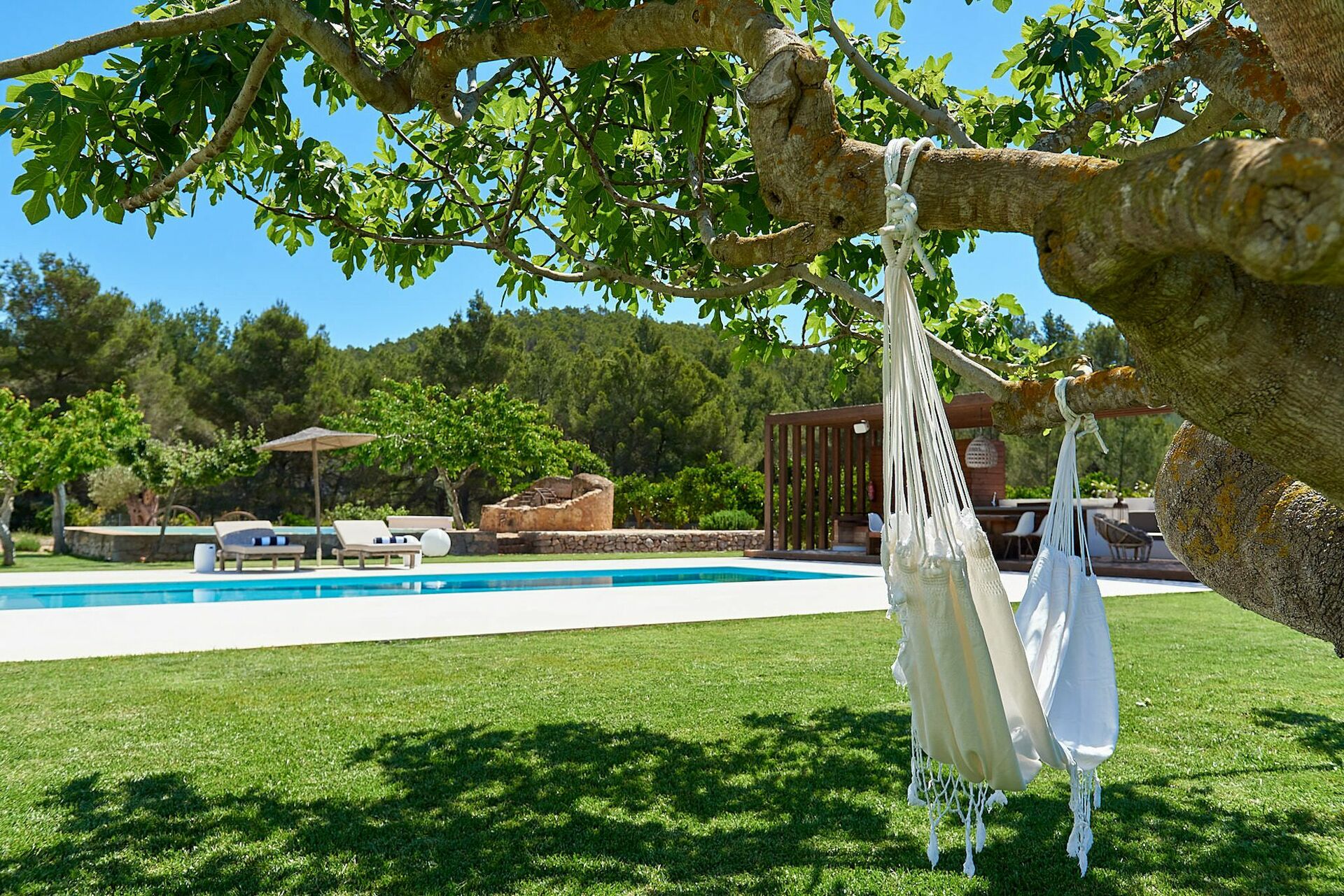 Huset er omgitt av uberørt natur og har en stor velstelt hage med solterrasse ved bassenget som er utstyrt med solsenger og parasoller. Her er det perfekt å kjøle seg av eller slappe av på varme sommerdager. Gjestene kan ta i bruk de mange møblerte uteområdene med bord, stoler, sofaer og lenestoler. I tillegg er det også en plass for uteservering.