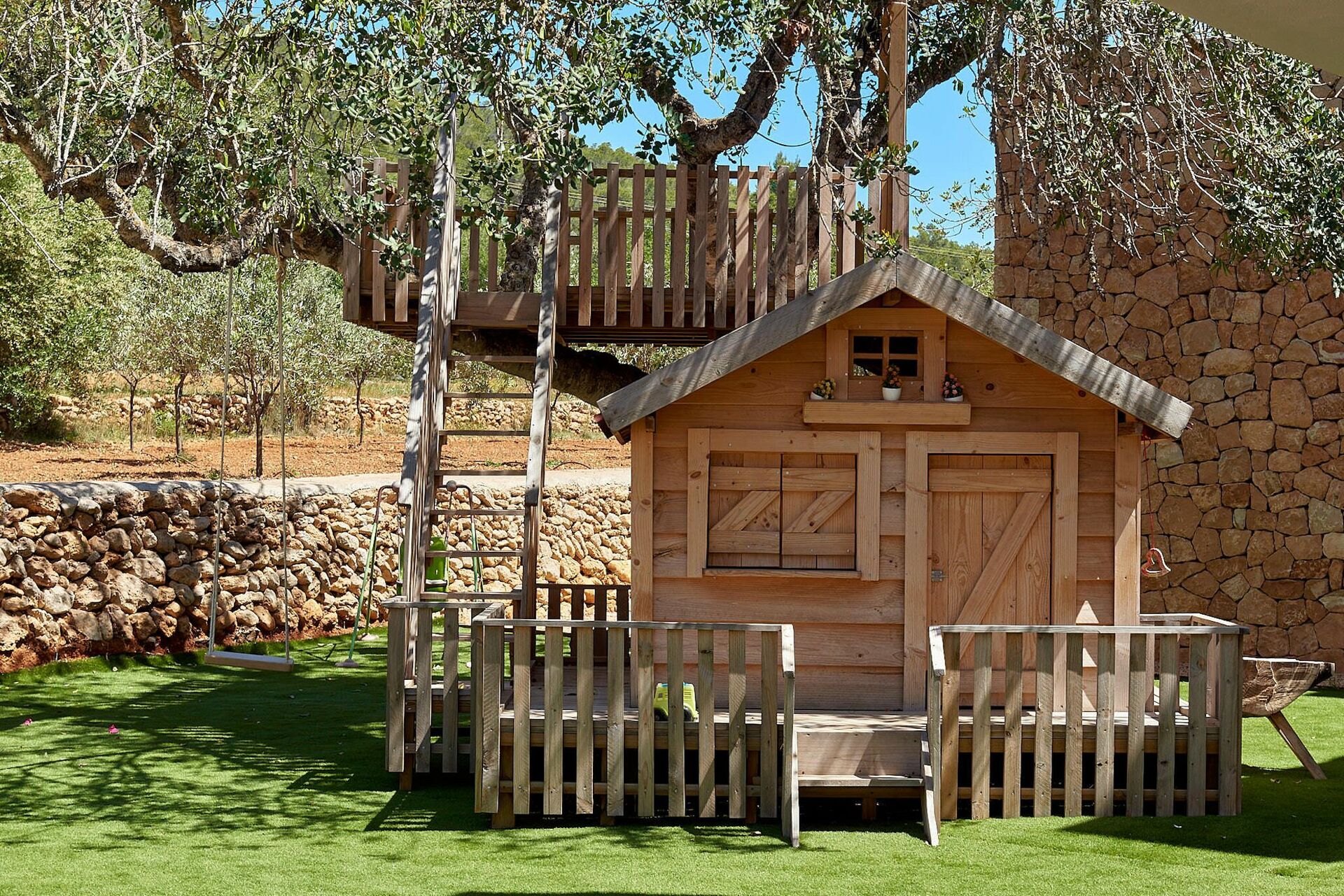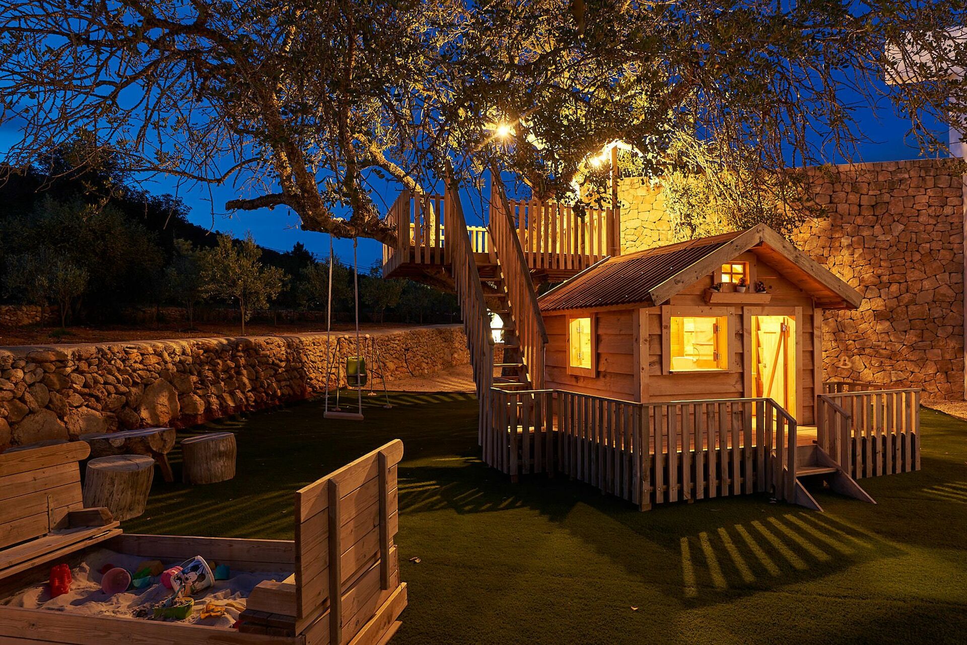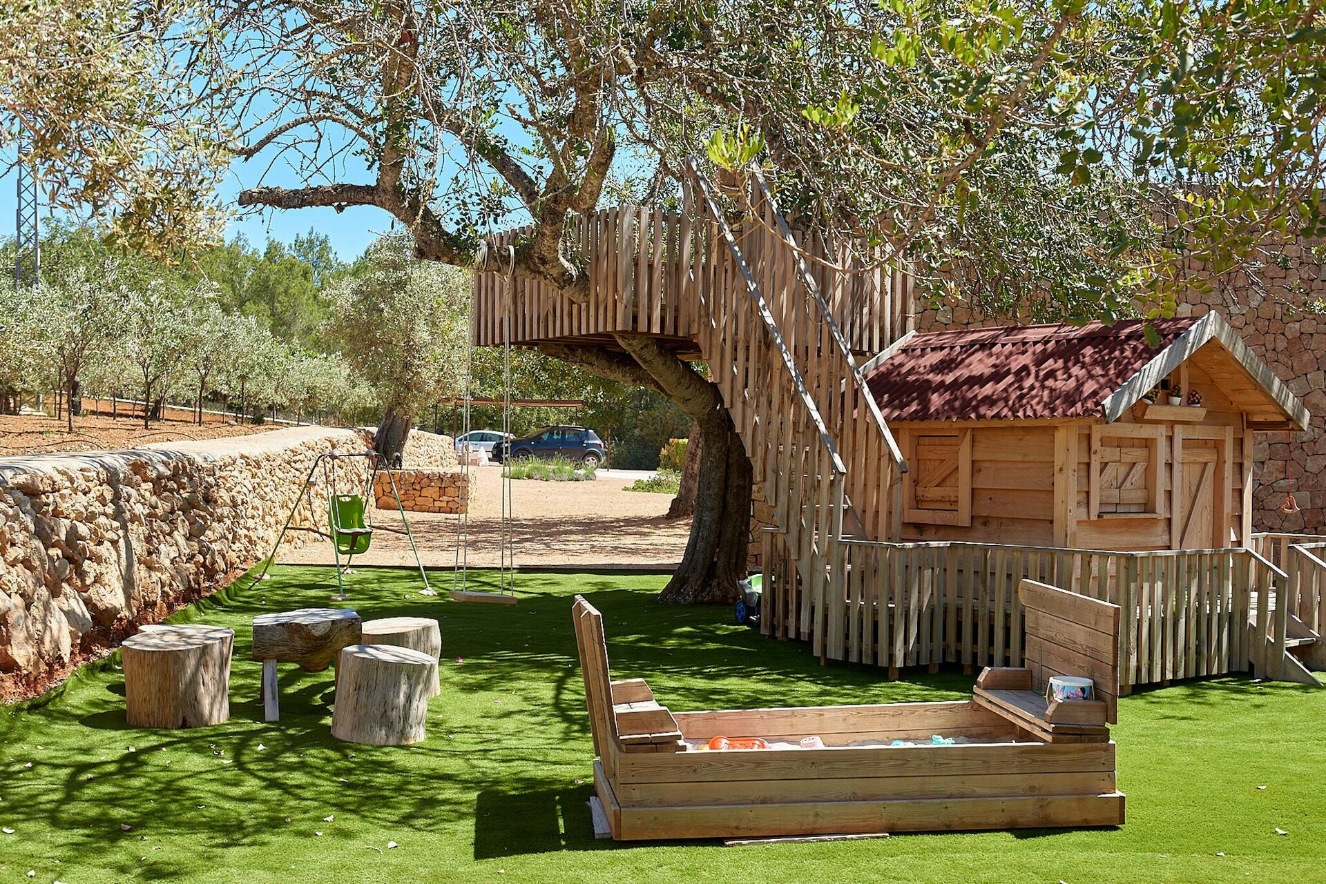 Huset er omgitt av uberørt natur og har en stor velstelt hage med solterrasse ved bassenget som er utstyrt med solsenger og parasoller. Her er det perfekt å kjøle seg av eller slappe av på varme sommerdager. Gjestene kan ta i bruk de mange møblerte uteområdene med bord, stoler, sofaer og lenestoler. I tillegg er det også en plass for uteservering.